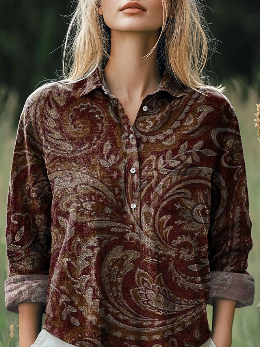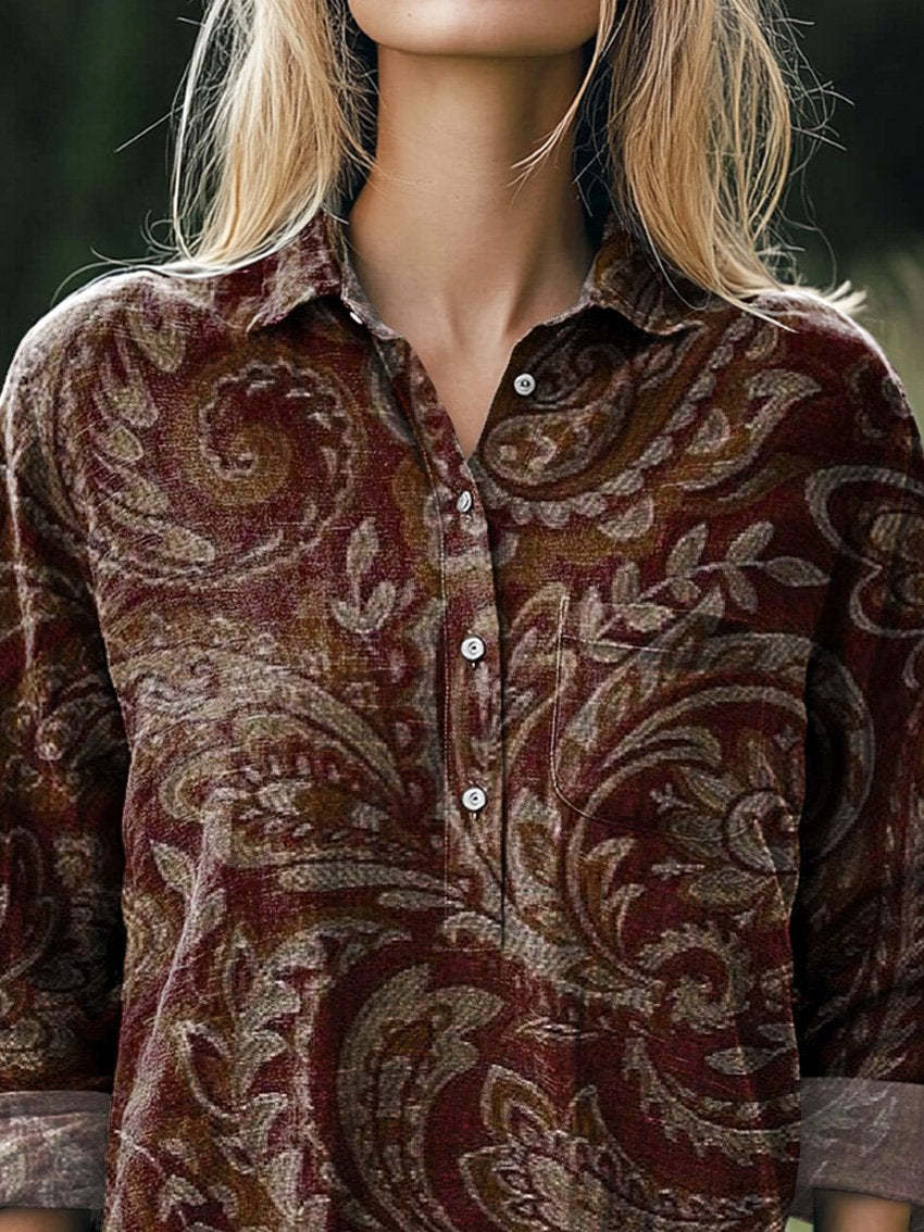 Ethnic Style Floral Pattern Printed Women's Casual Cotton And Linen Shirt