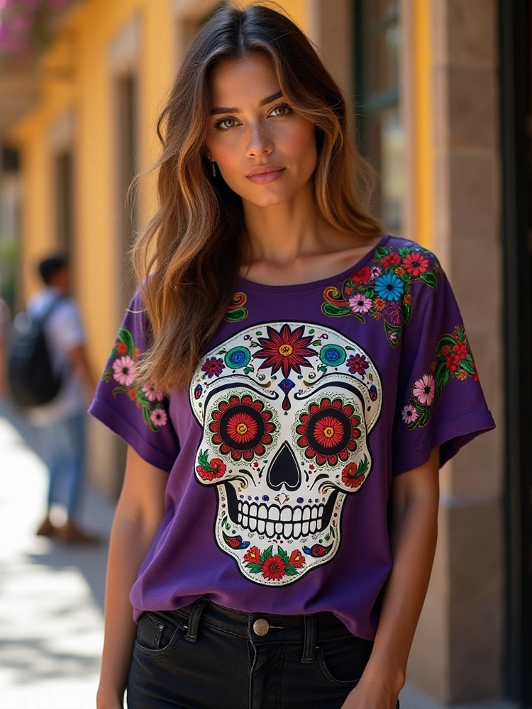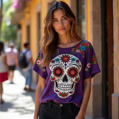 Retro Classy Mexican Day Of The Dead Print Linen Crew Neck Shirt