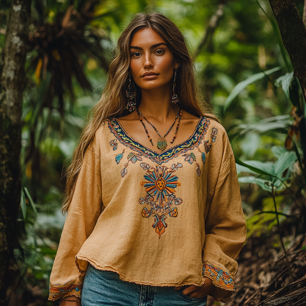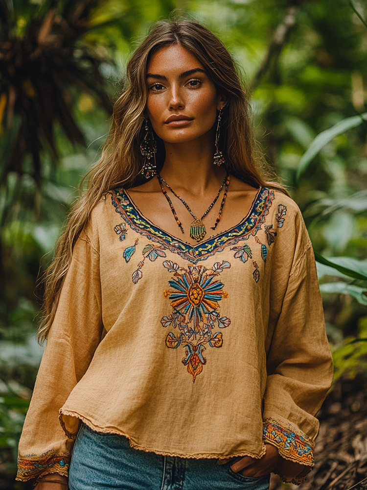 Retro Floral Tribal Embroidery Art Cotton And Linen Blend Loose Blouse