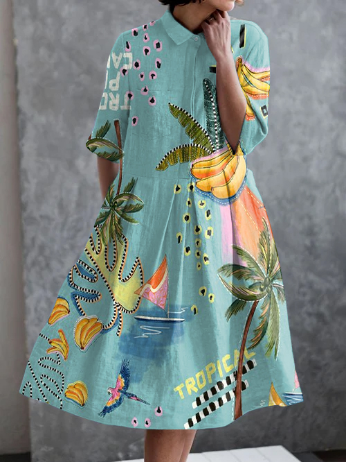 Vacation Tropical Jungle Art Print Casual Pocket Half Sleeve Dress