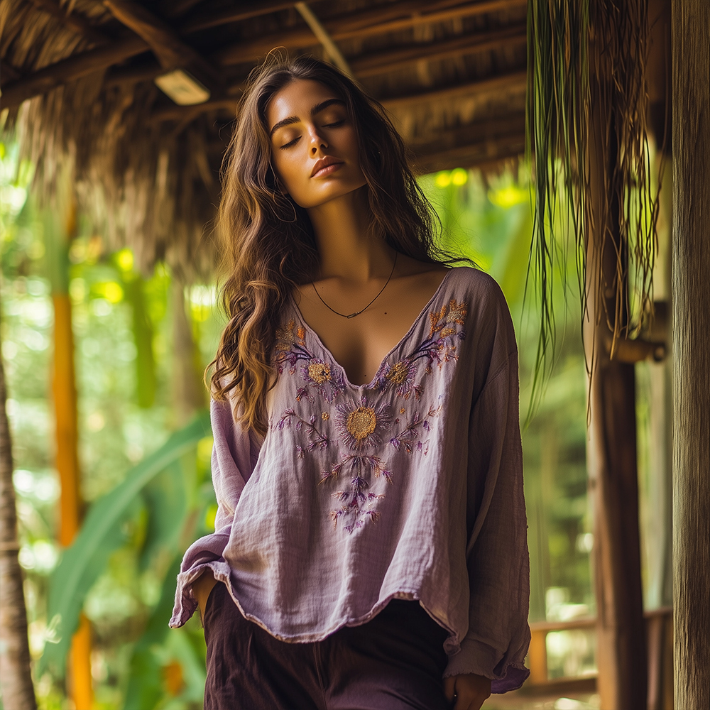 Vintage Bohemian Floral Gold Thread Embroidery Linen V-neck T-shirt