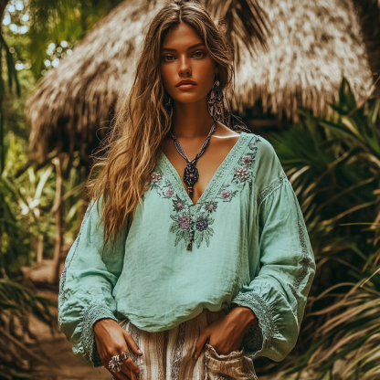 Vintage Bohemian Tribal Art Embroidery Print Cotton And Linen V-neck Loose Shirt