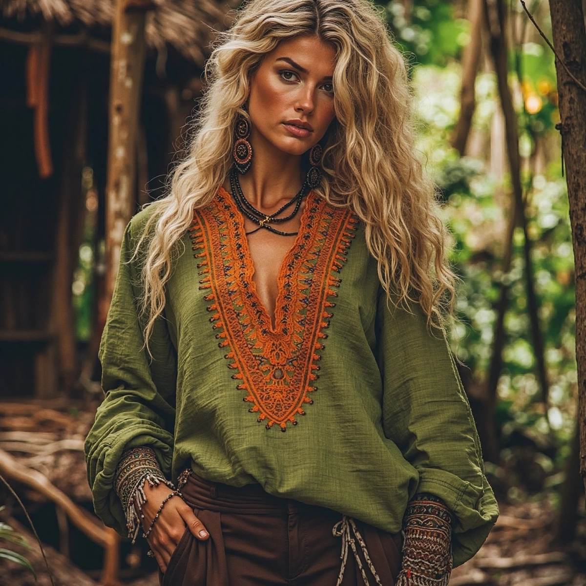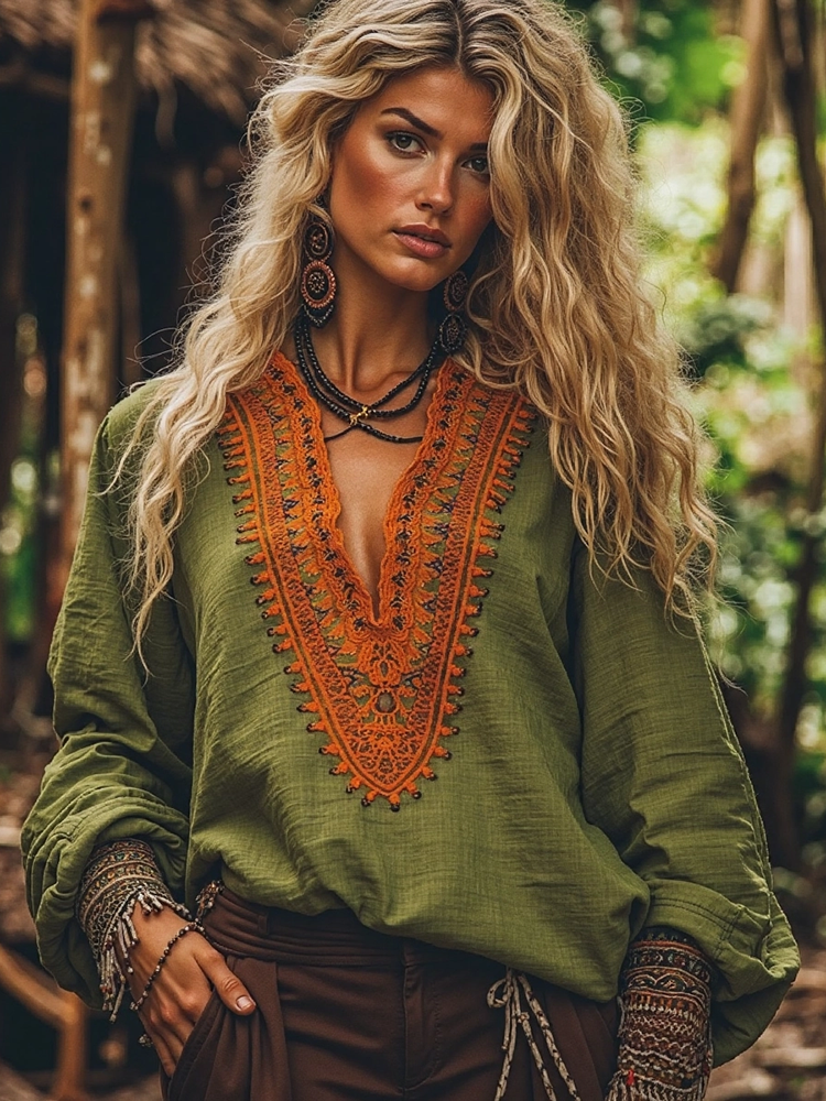 Vintage Embroidered V-neck Linen Blend Loose T-shirt