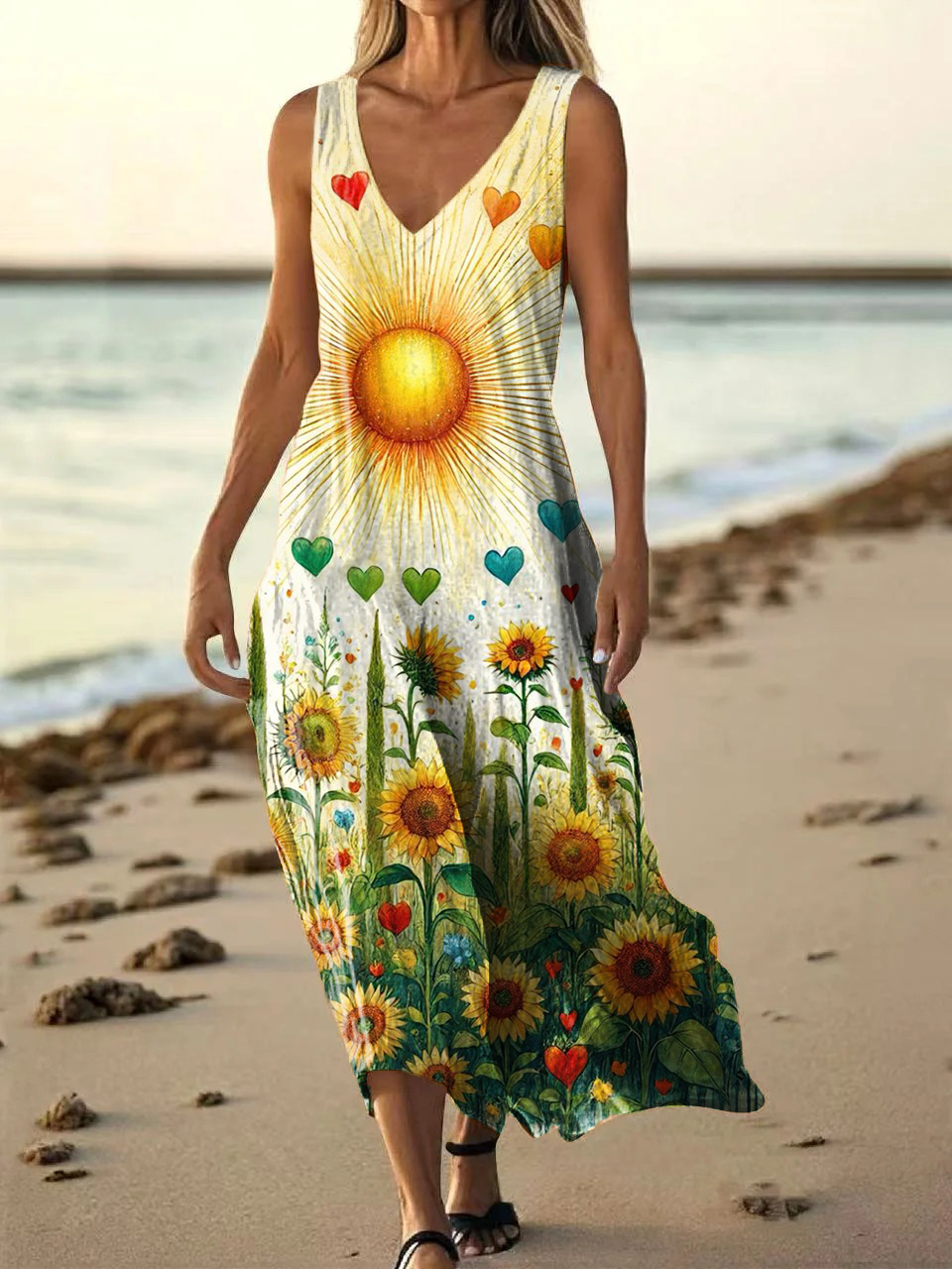 Women's Bohemian Floral Art Print Pocket Cotton Dress