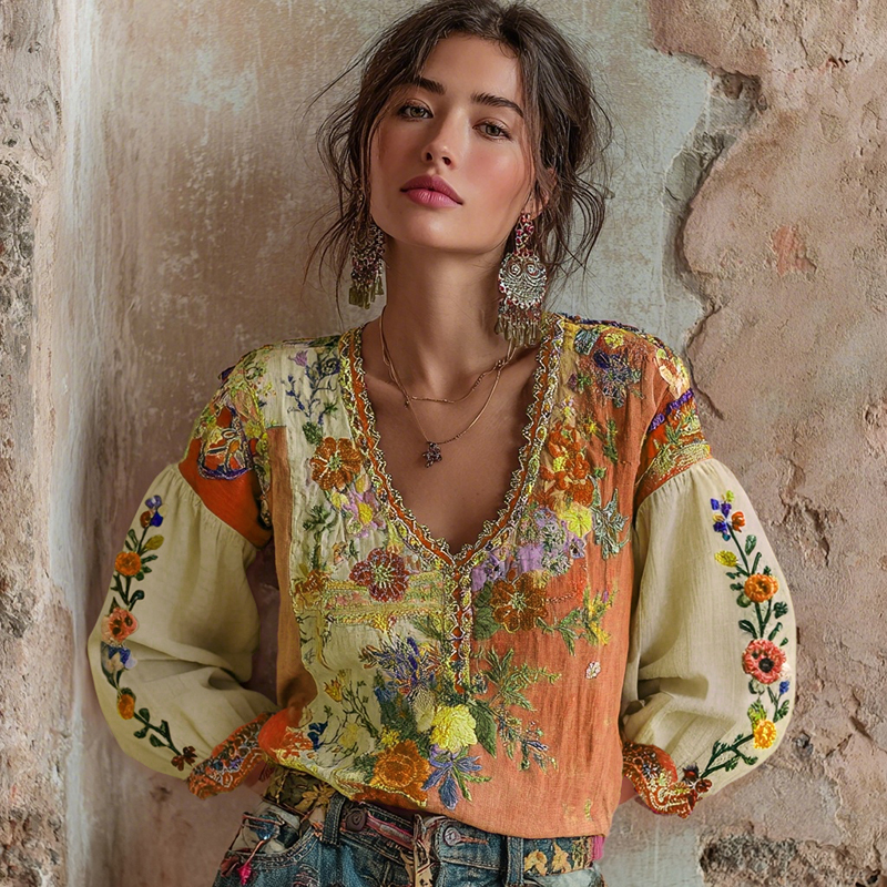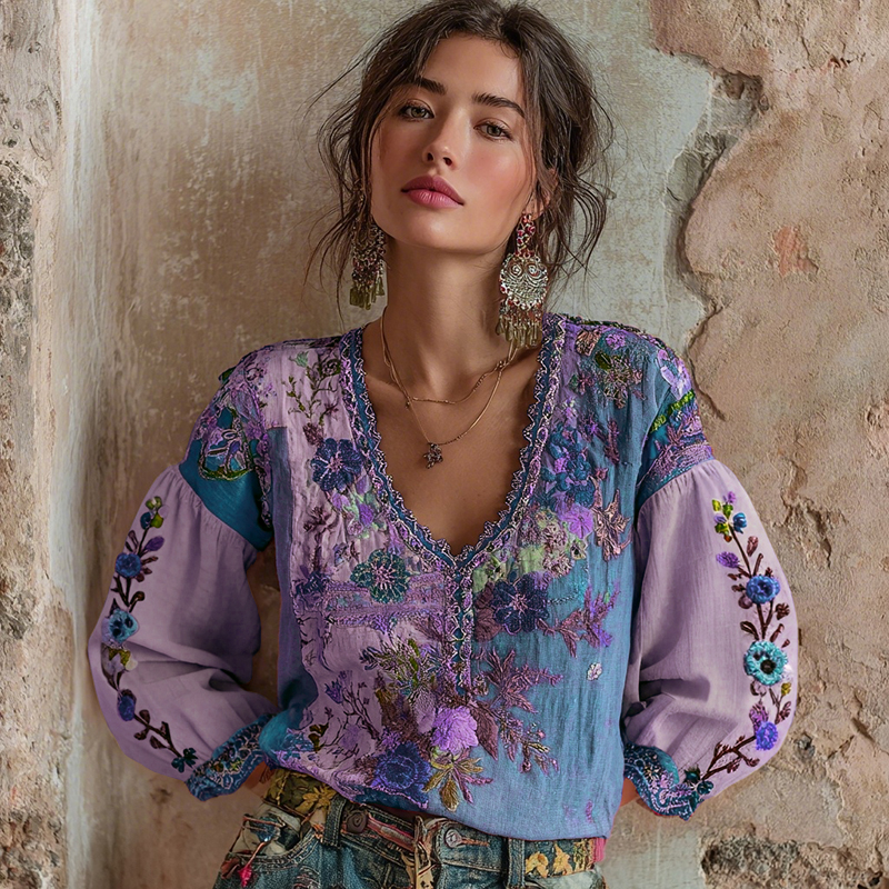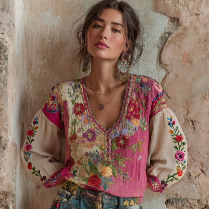 Women's Bohemian Floral Embroidery Art V-neck Contrast Color Long Sleeve Linen Blend T-shirt