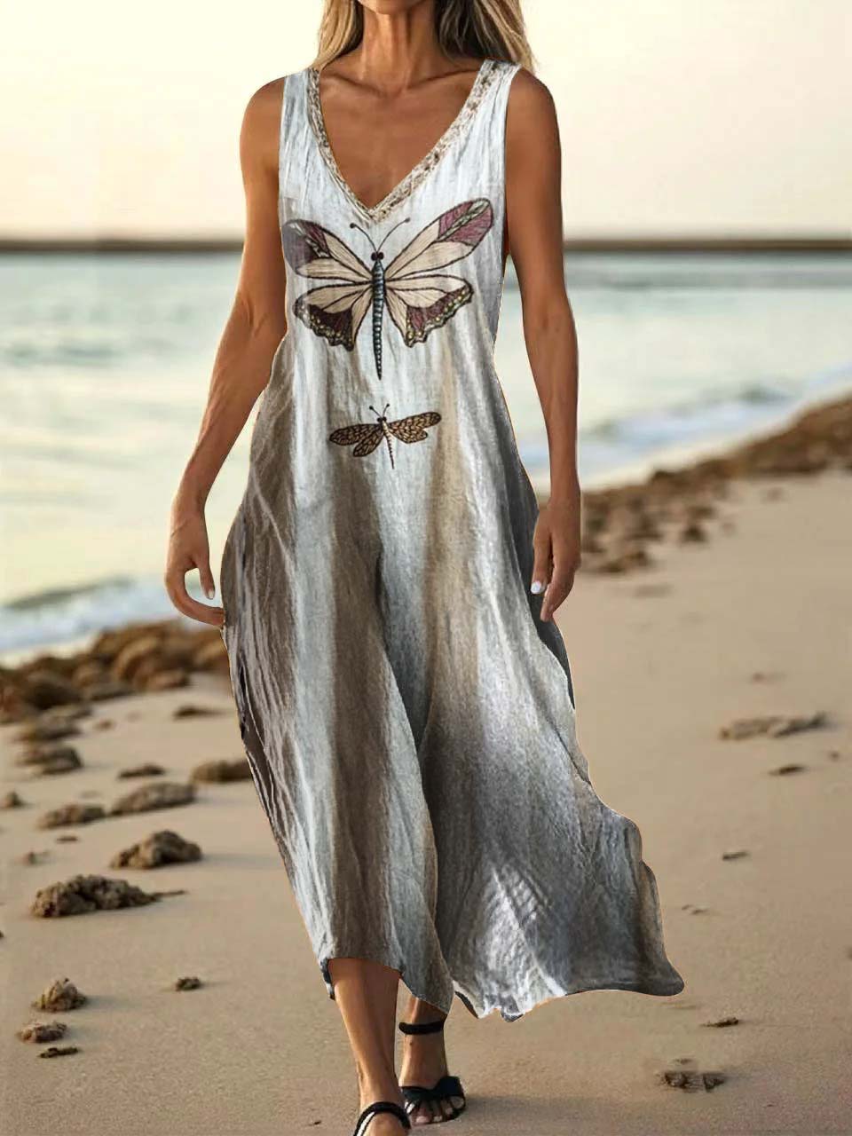 Women's Butterfly Embellished Pattern Art Print Pocket Cotton Dress