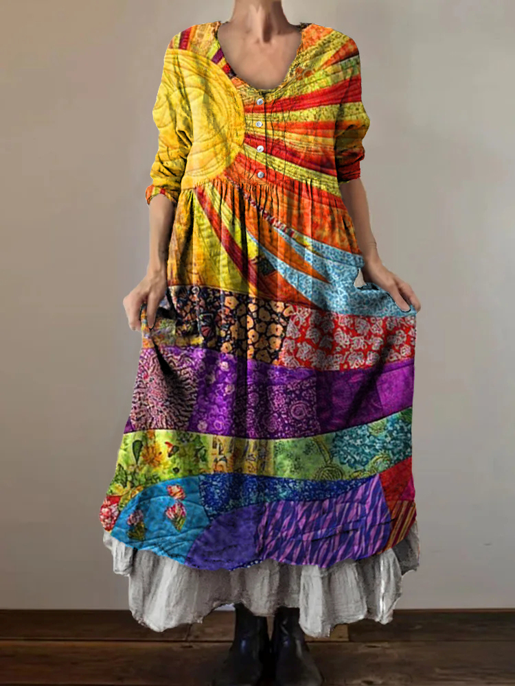 Women's Colorful Sun Floral Collage Art Print V-Neck Button Pocket Cotton Dress