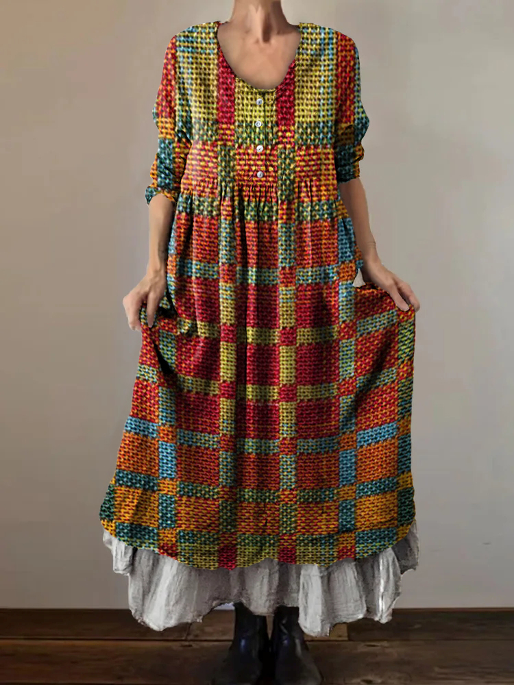 Women's Gradient Check Art Print V-Neck Button Pocket Cotton Dress