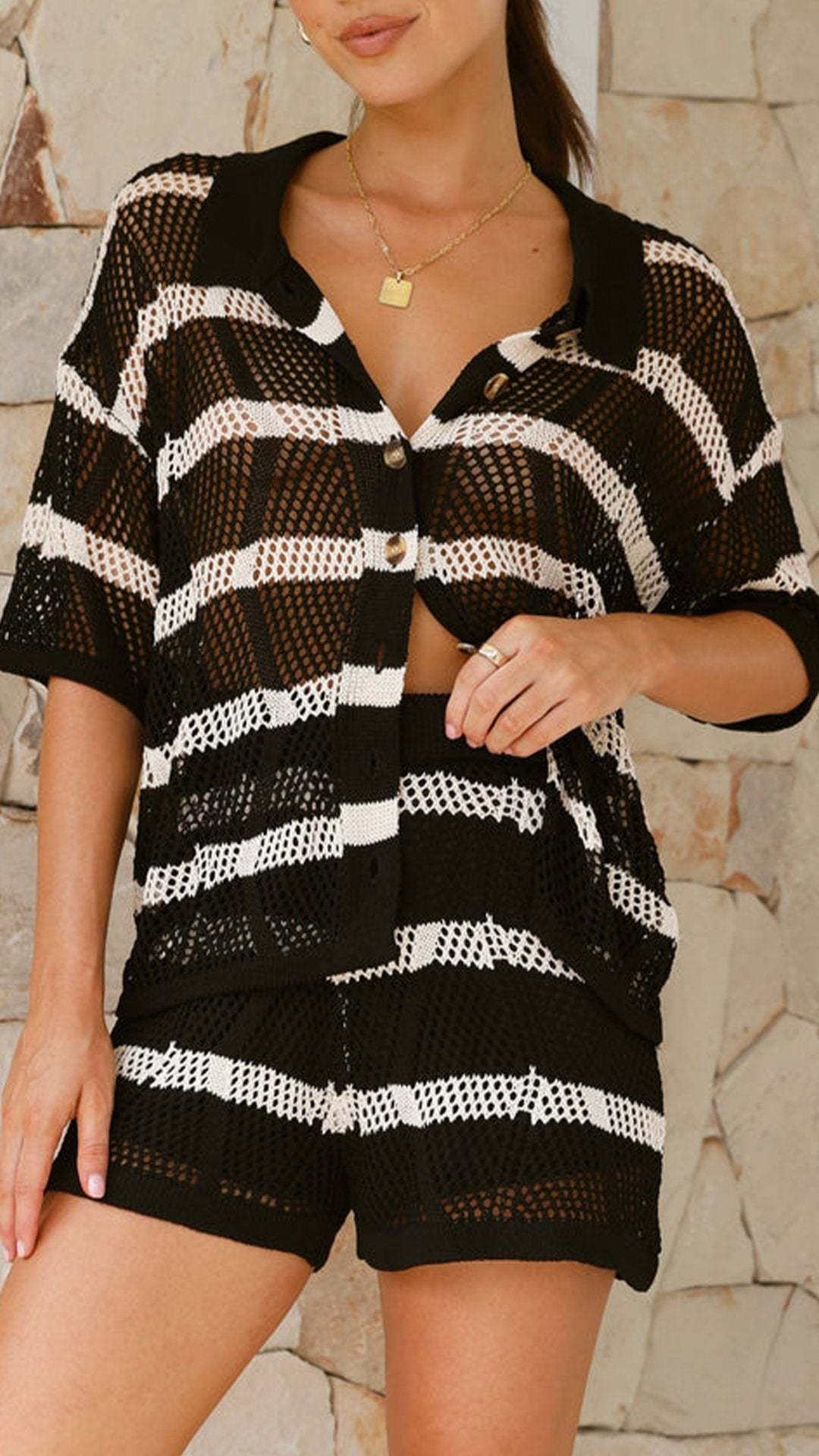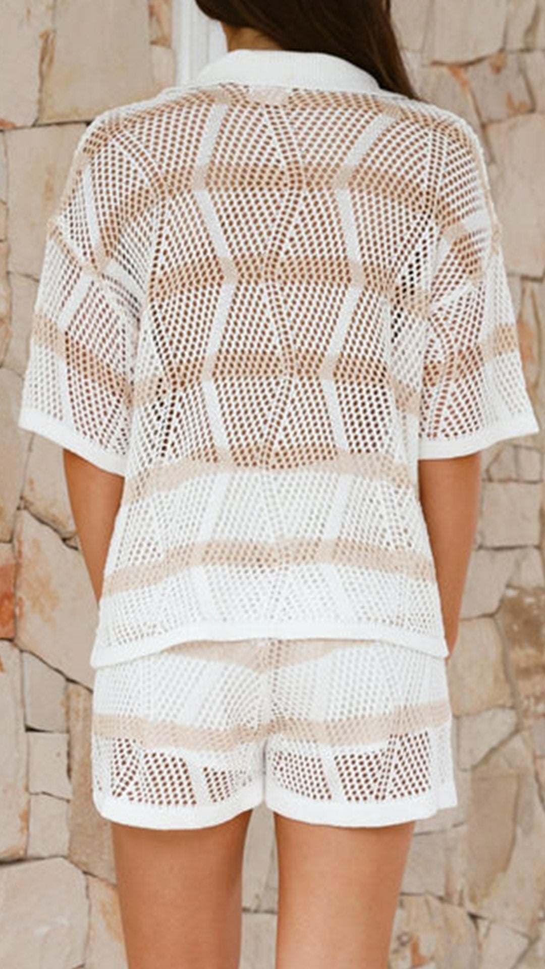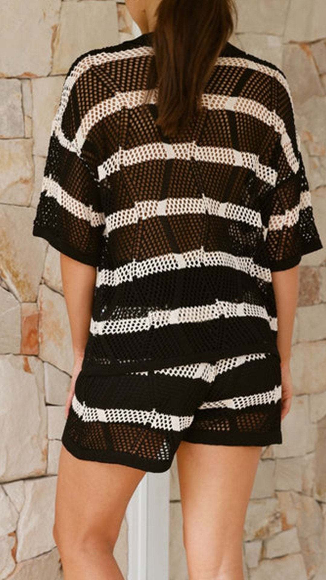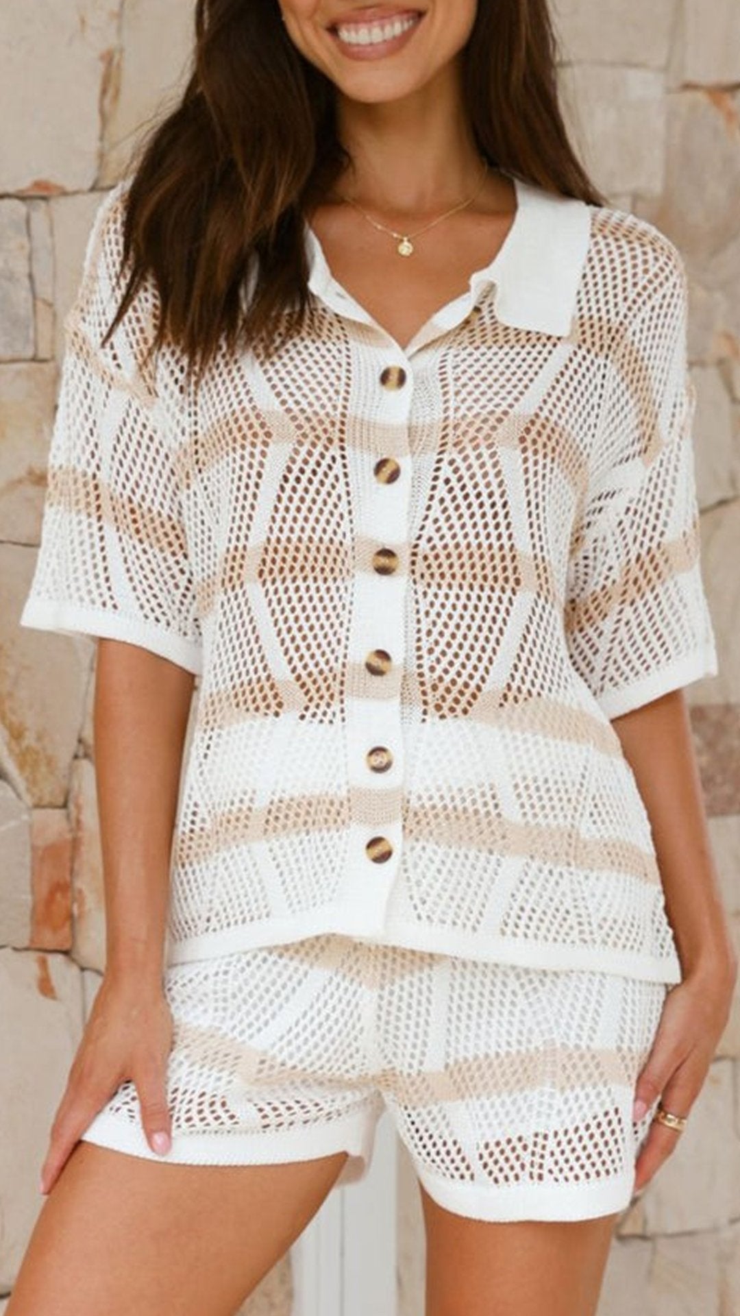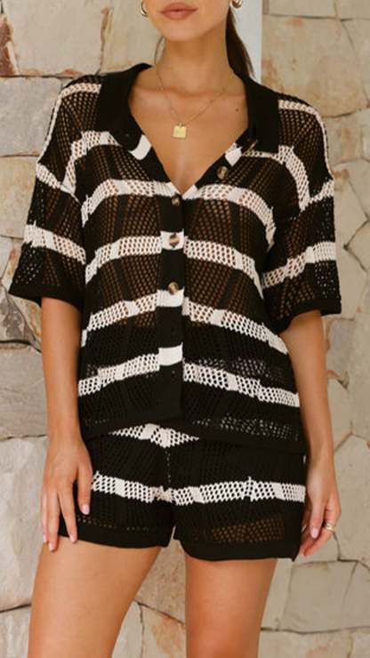 Women's Lapel Short Sleeved Hollowed Out Striped Casual Suit