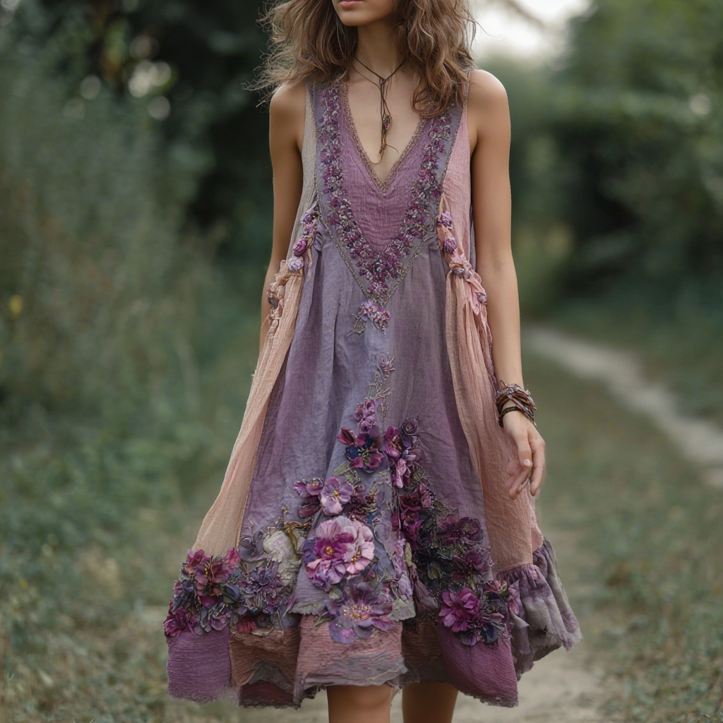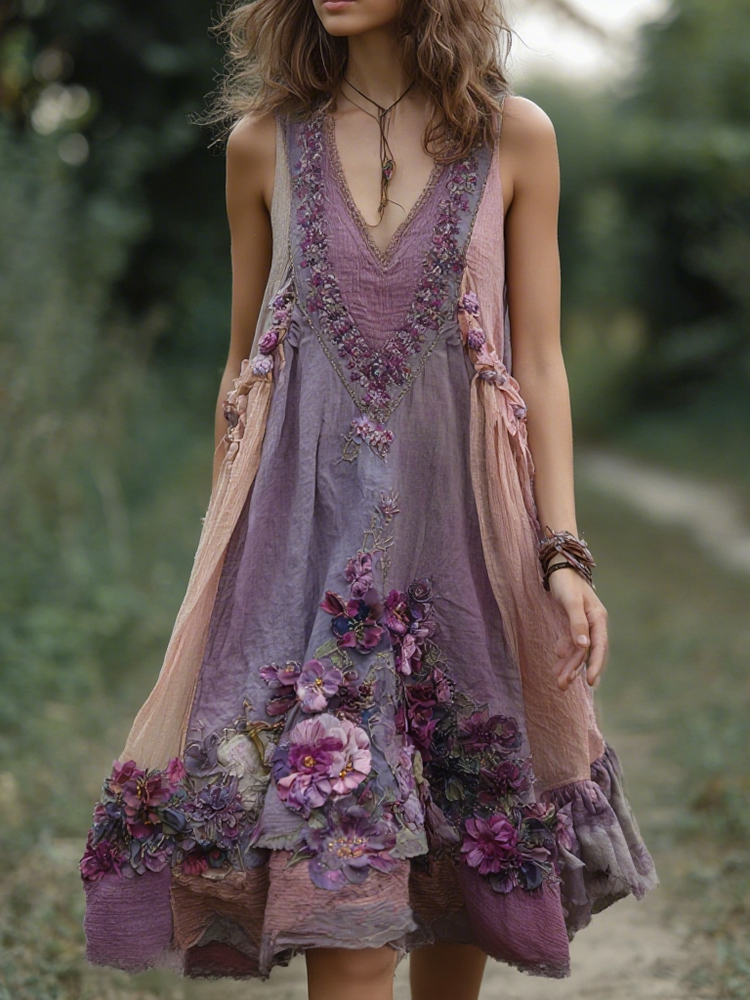 Women's Retro Purple Floral Stitching Casual Sleeveless Dress
