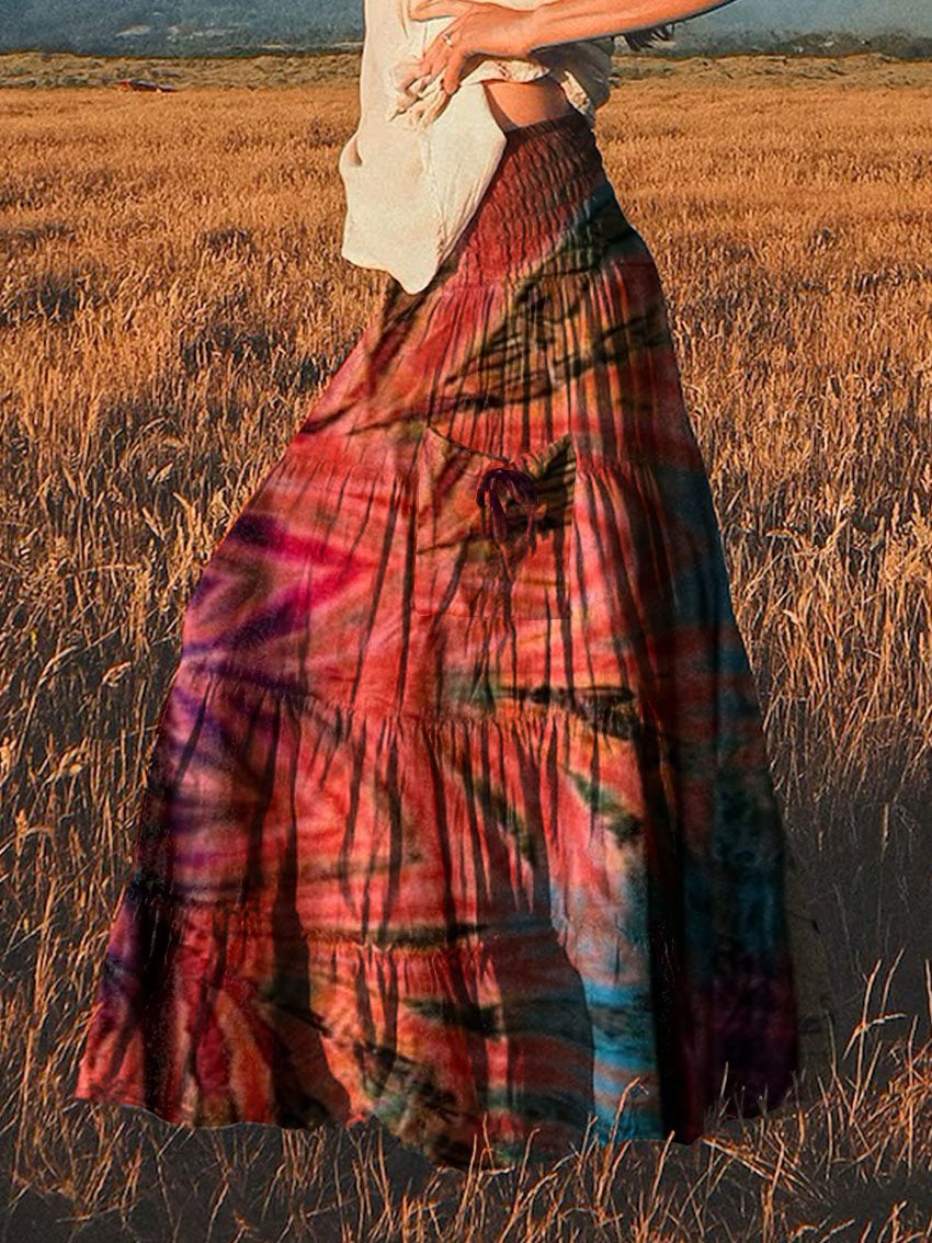 Women's Retro Tie-Dye Hippie Print Cotton Pocket Skirt
