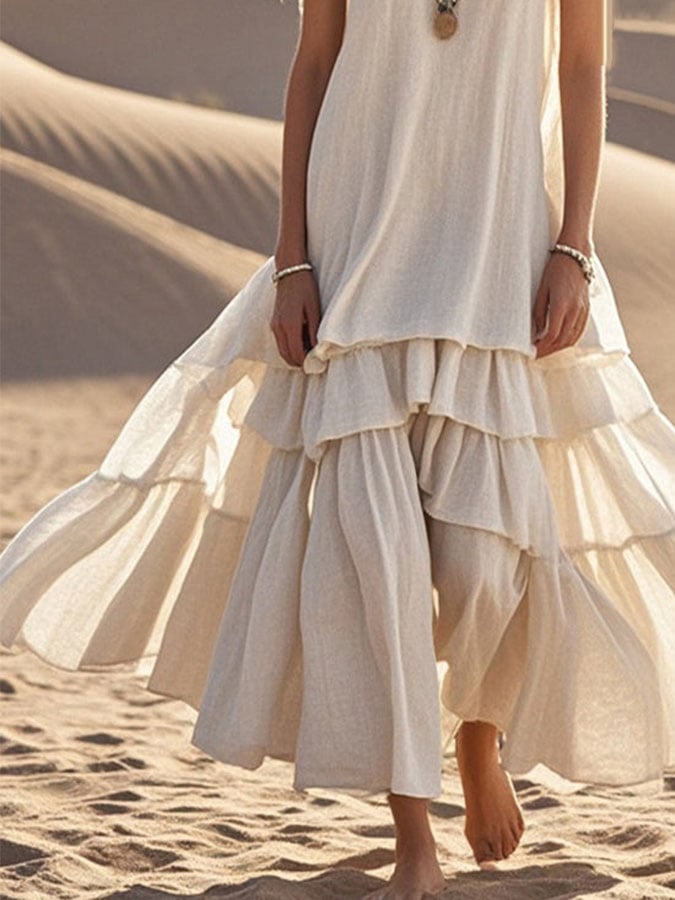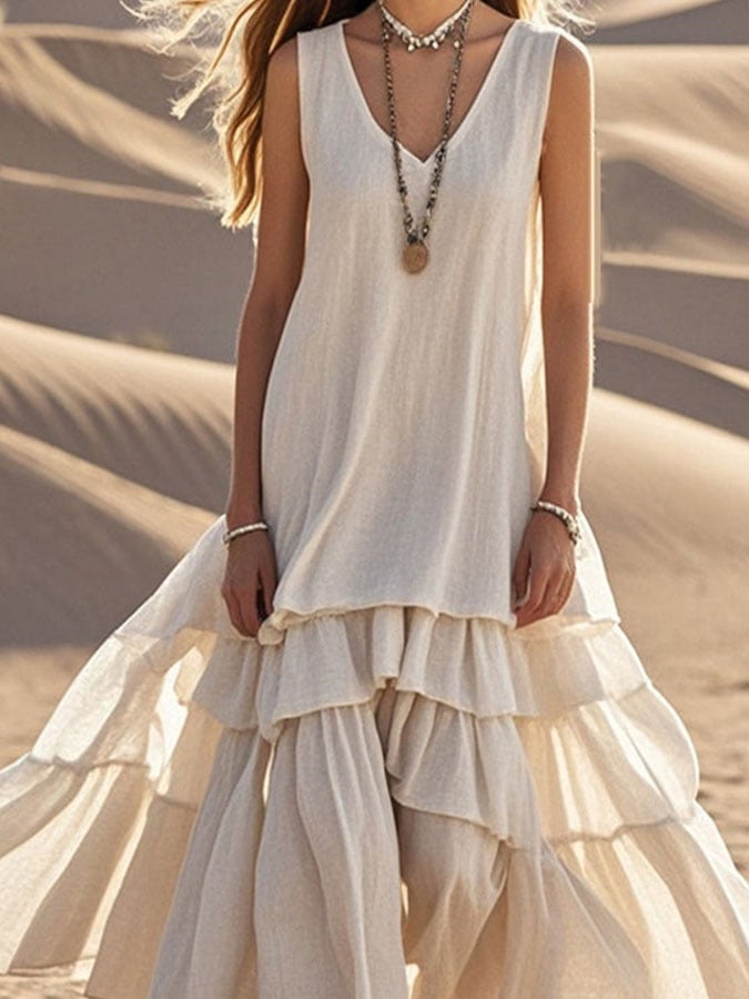 Women'S Solid Color V-Neck Loose Ruffled Large Skirt Sleeveless Dress