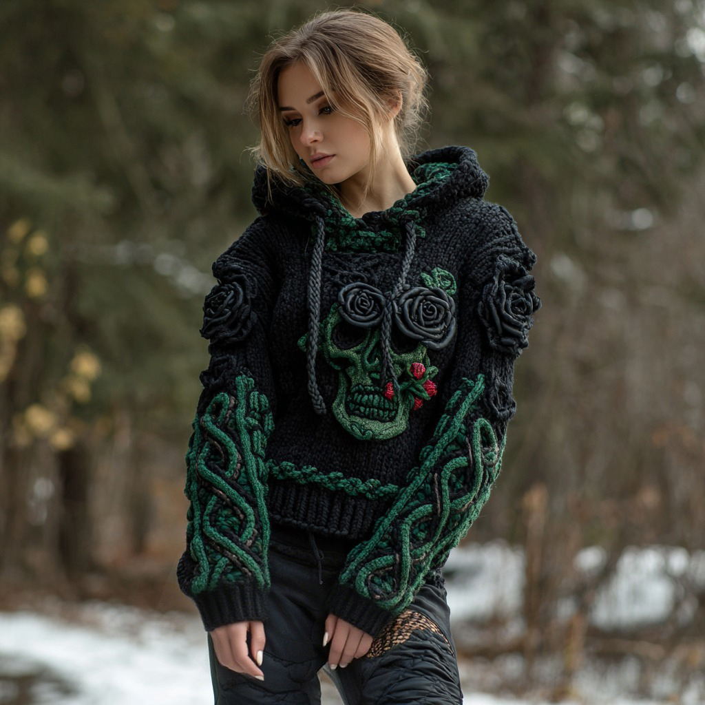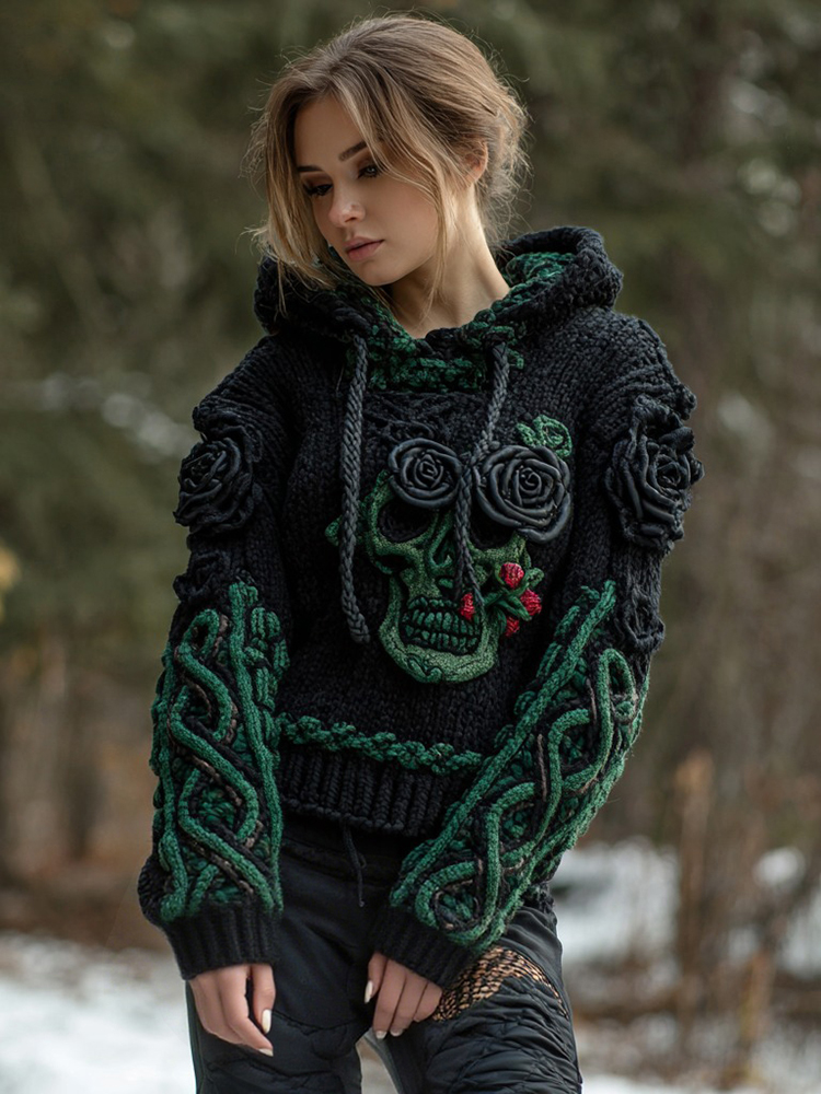 Women's Vintage Celtic Knot Skull And Rose Patchwork Hooded Sweater