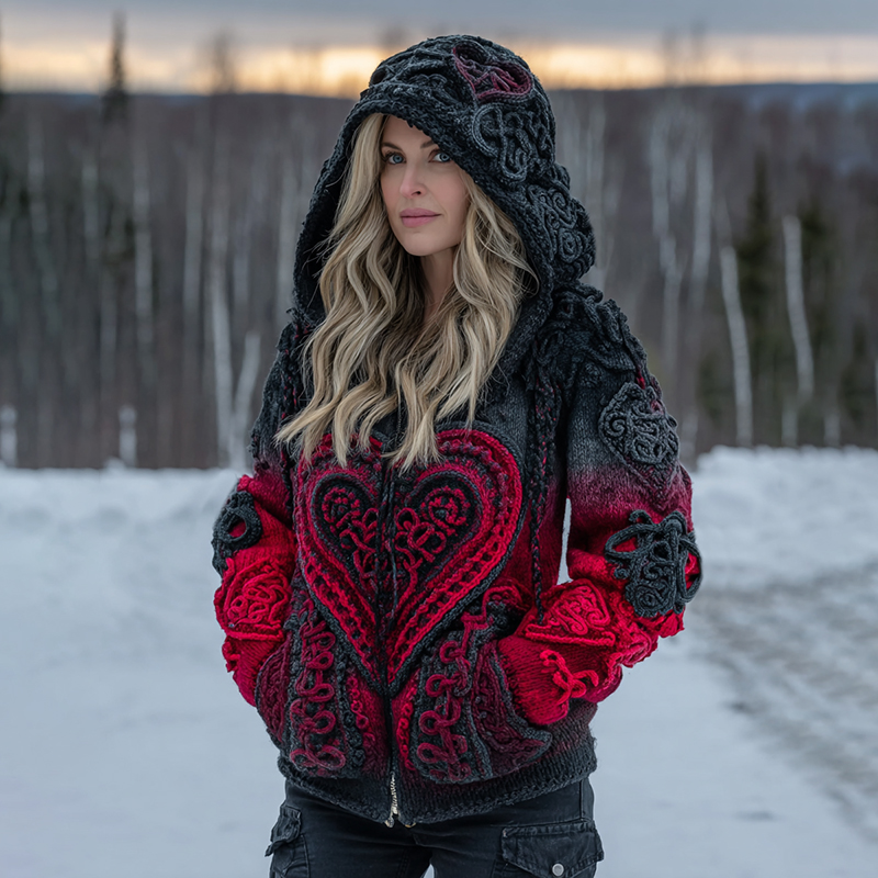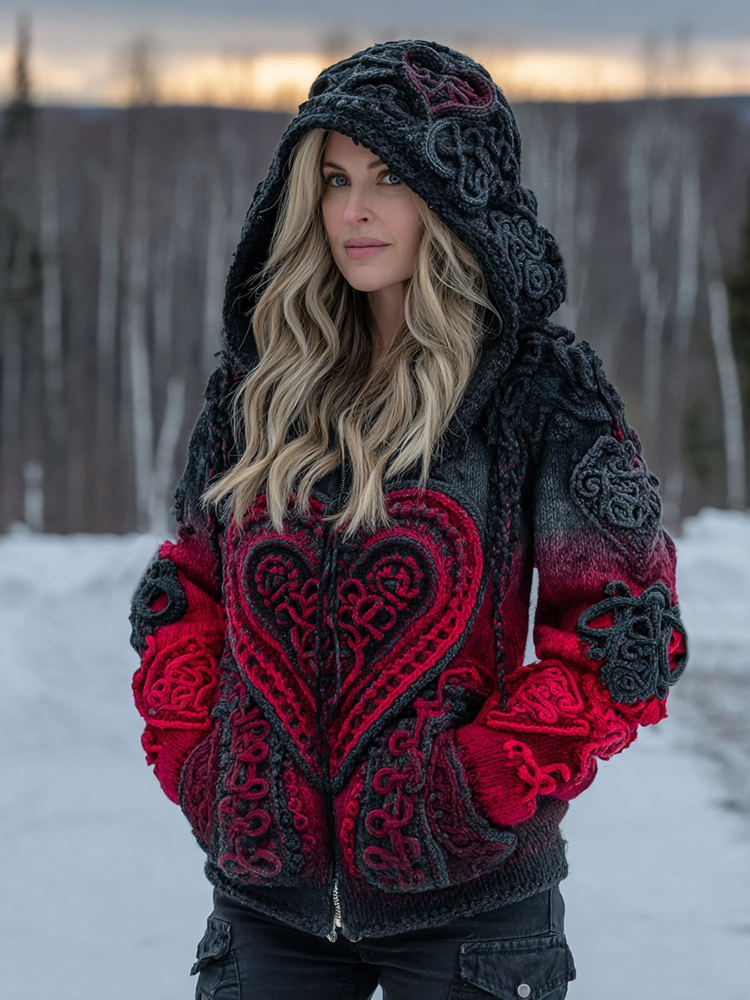 Women's Vintage Heart Art Cozy Knit Zip Up Hooded Sweater
