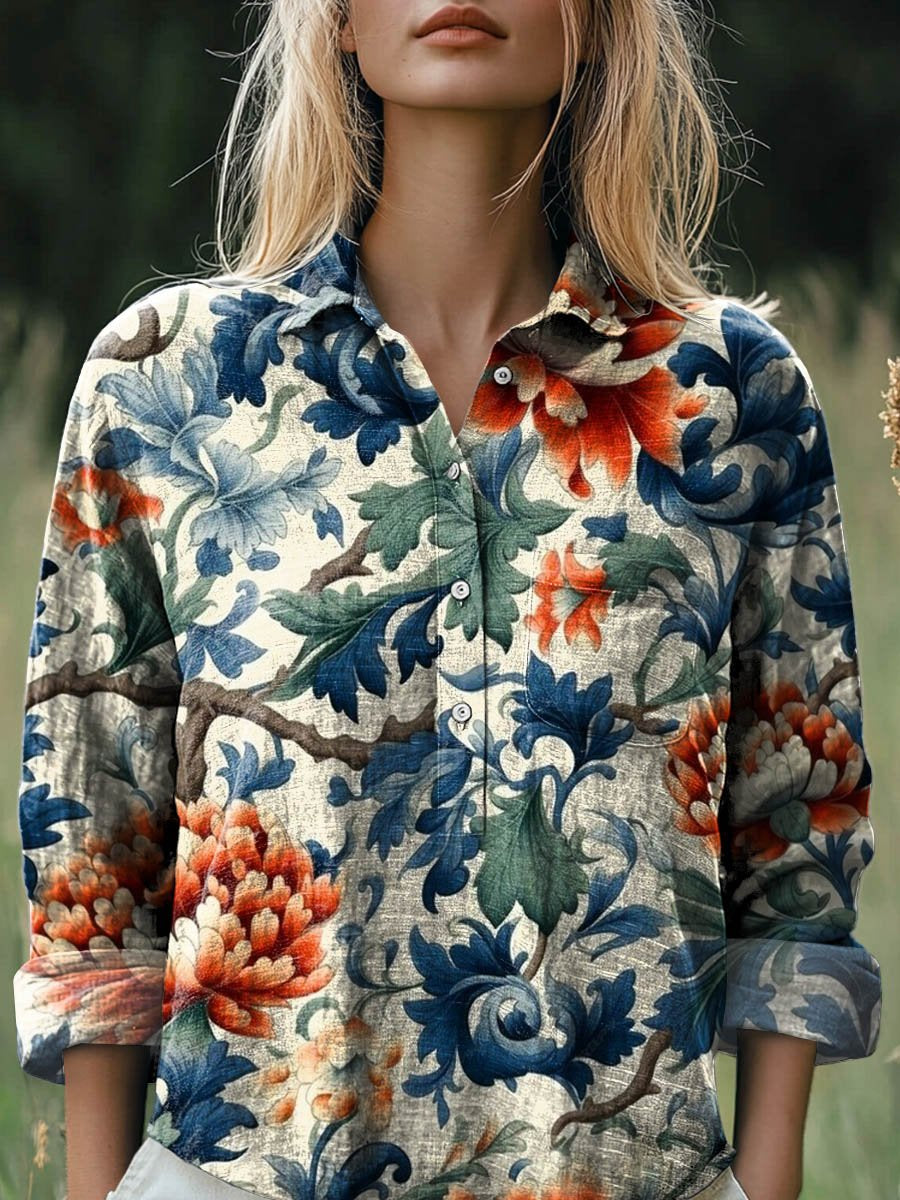 Women's Vintage Lovely Floral Art Print Casual Cotton And Linen Shirt