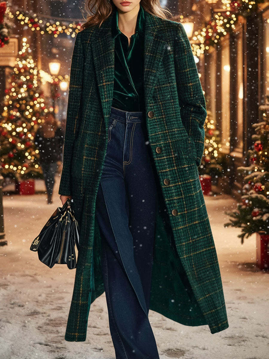 【24-hour shipping out】Casual Loose Retro Pocket Woolen Plaid Mid-Length Coat