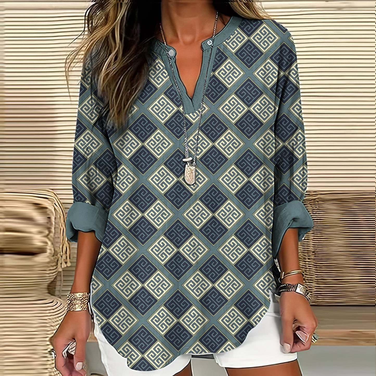 Greek Key Print V-neck Linen Blend Blouse
