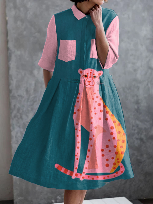 Holiday Leopard Colorblock Print Casual Pocket Half Sleeve Dress