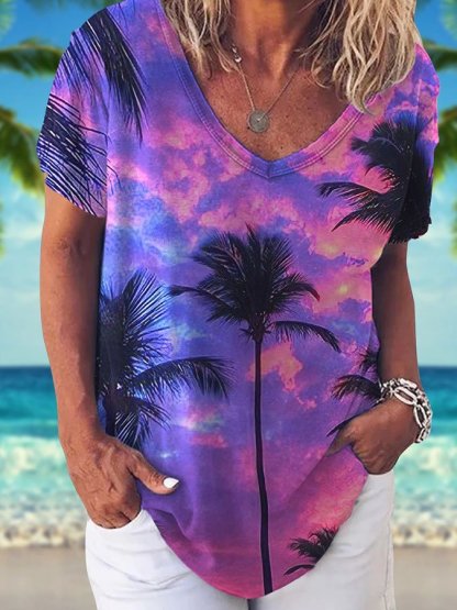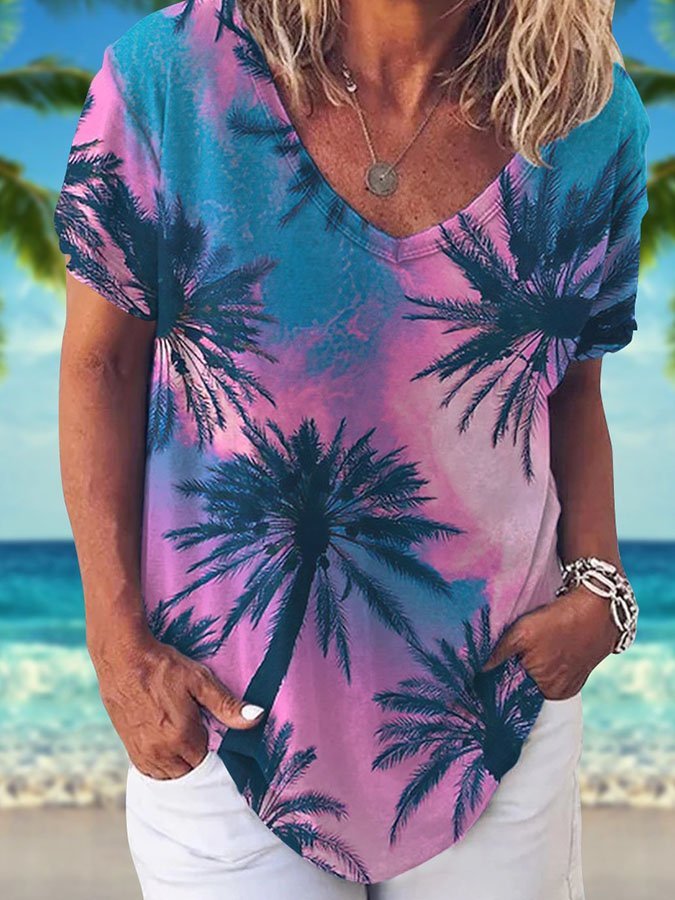 V-Neck Palm Tree Print Short Sleeve T-Shirt