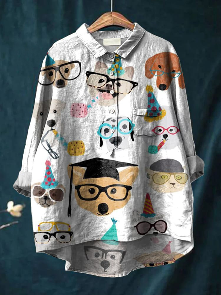 Women's Cartoon Puppy with Glasses Print Casual Cotton And Linen Shirt