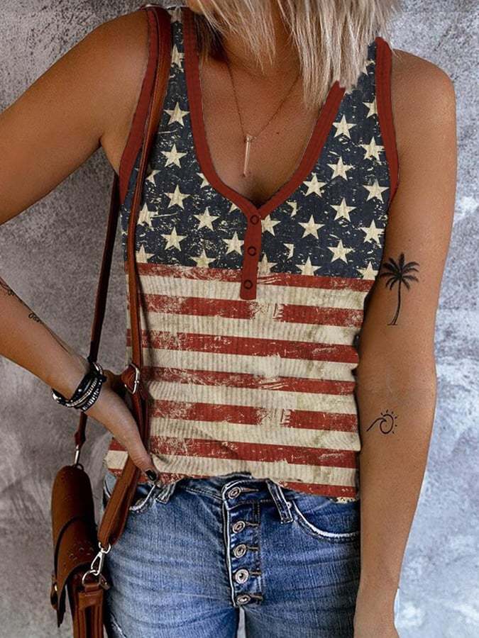 Women's Independence Day Vintage America Flag Print Button V Neck Vest