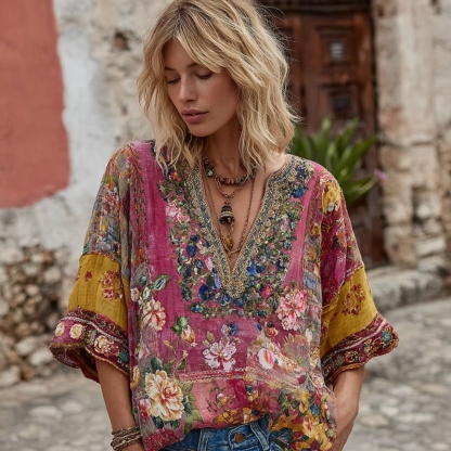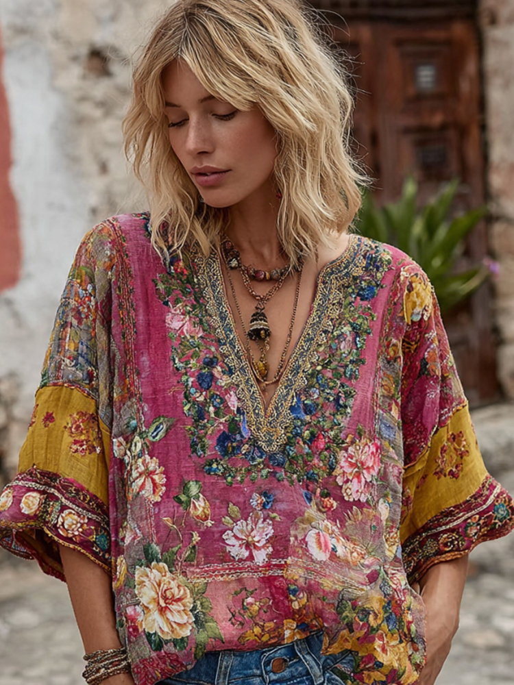 Women's Vintage Flower Embroidered Art V-neck Linen Blend Shirt