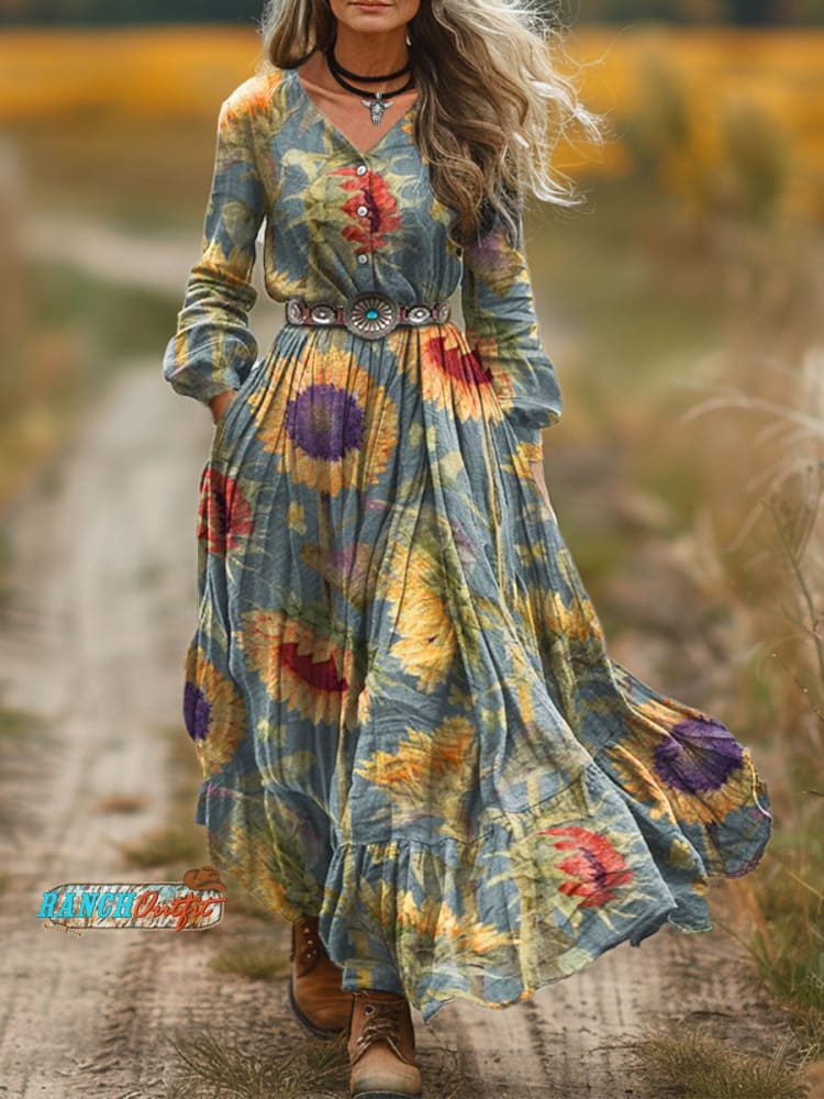 Women's Vintage Print V-Neck Button Pocket Cotton Dress