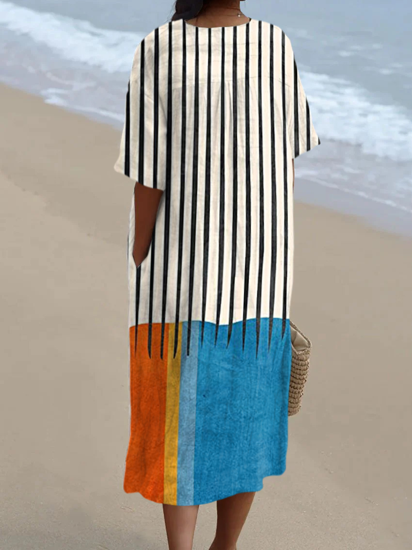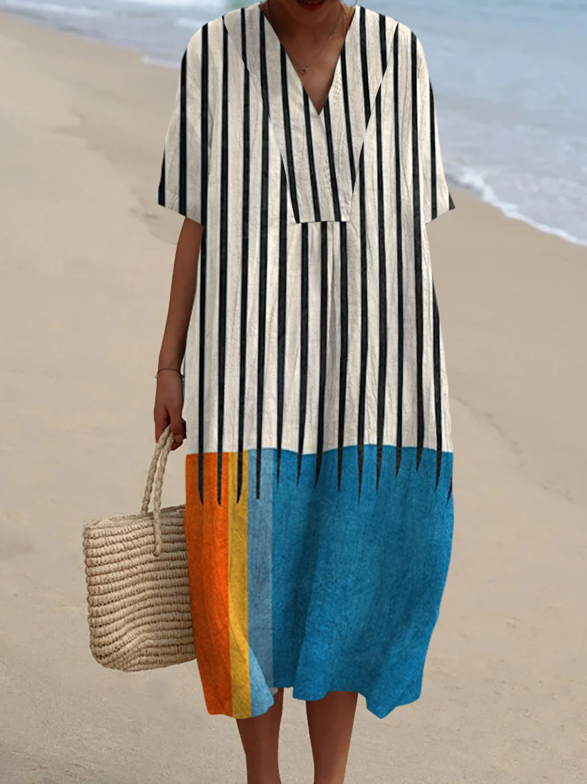 Bohemian Color Block Abstract Art Print V Neck Midi Dress
