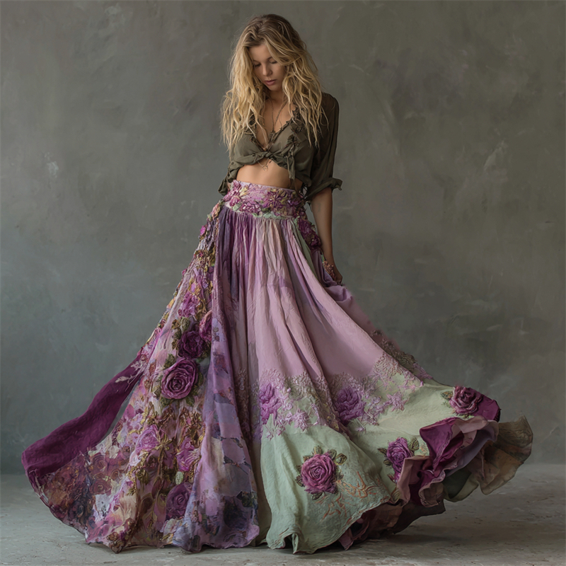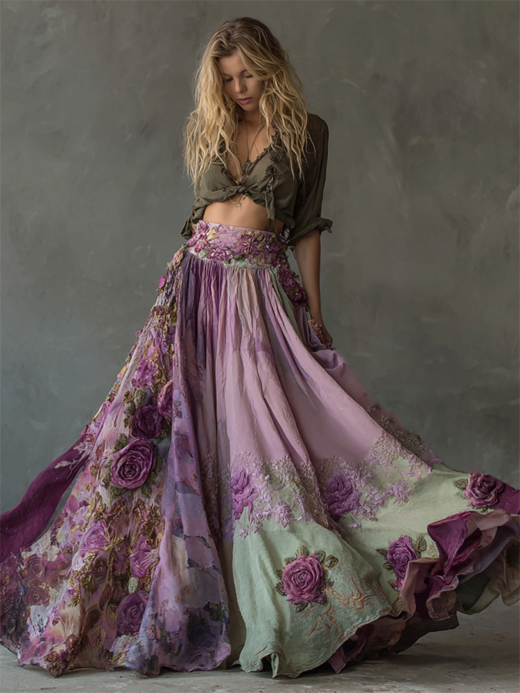 Boho Purple Roses Embroidered Floral Patchwork Flowy Wide Skirt