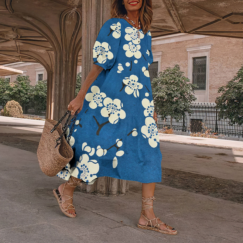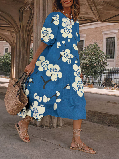 Causal Blue Floral Japanese Art And Spring Midi Dress