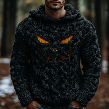 Halloween Evil Pumpkin Emoji Men's Chunky Knit Hooded Sweater