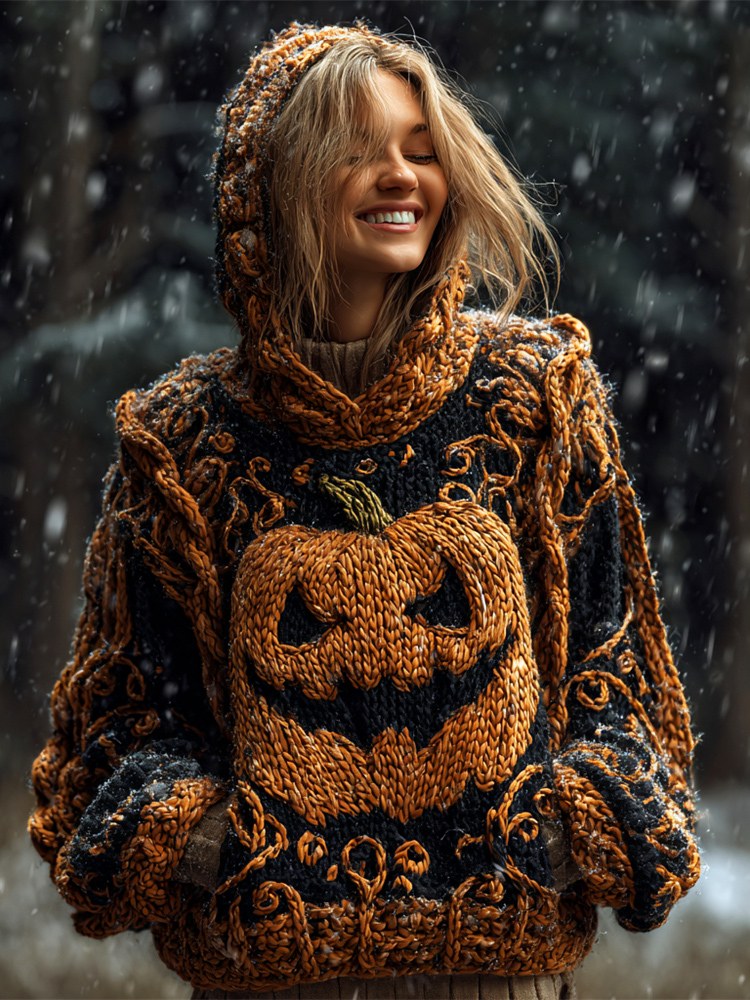 Halloween Spooky Pumpkin Lights Women's Chunky Knit Hooded Sweater