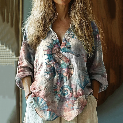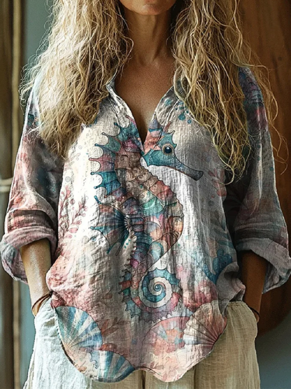 Vintage Holiday Seahorse Art Linen V Neck Long Sleeve Shirt