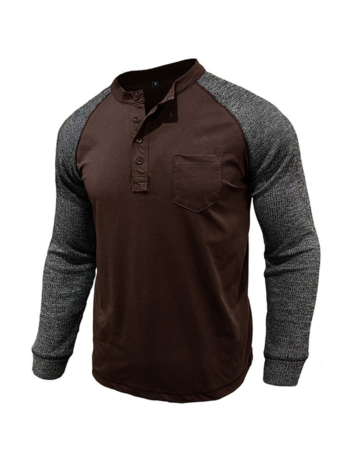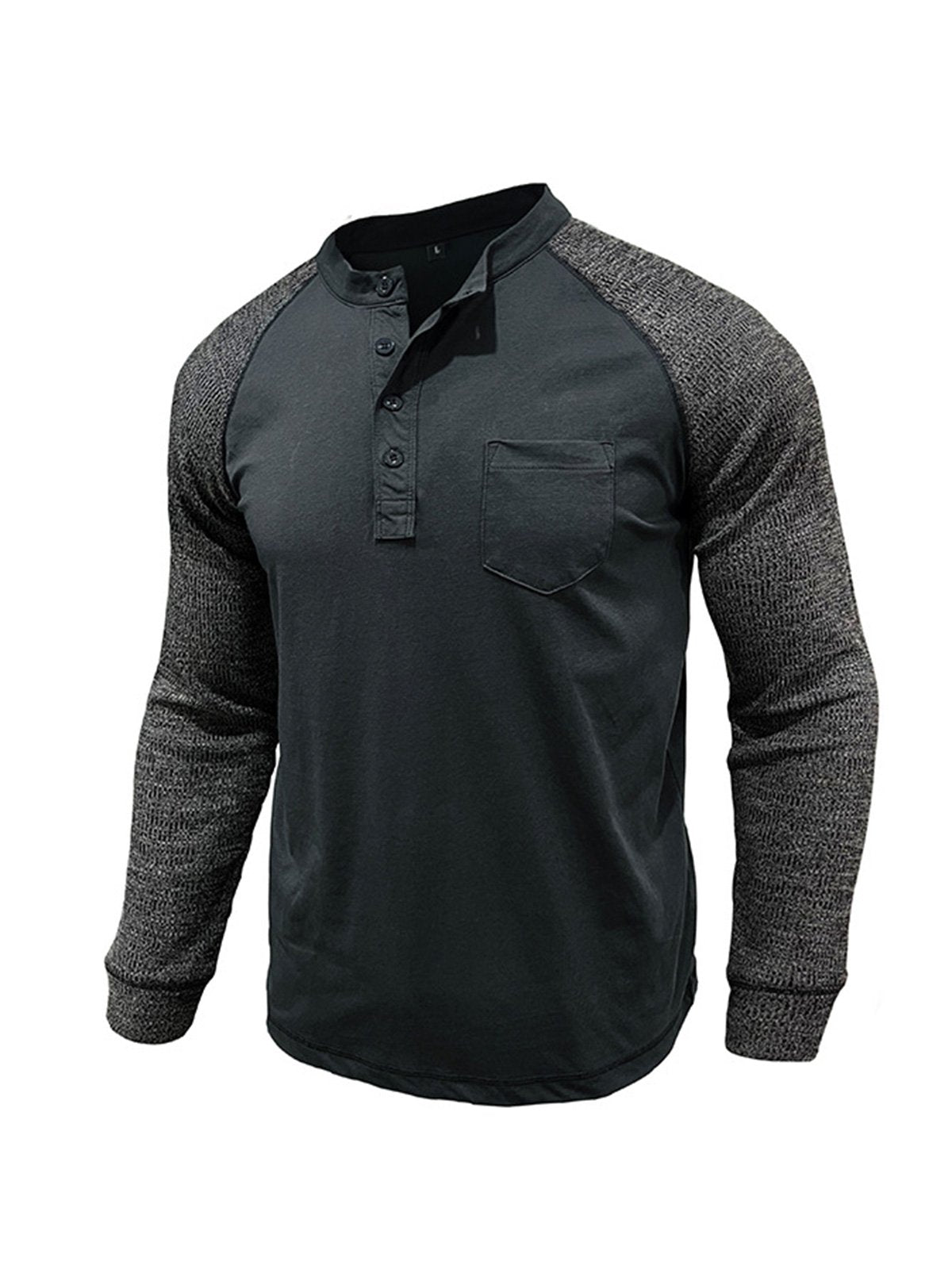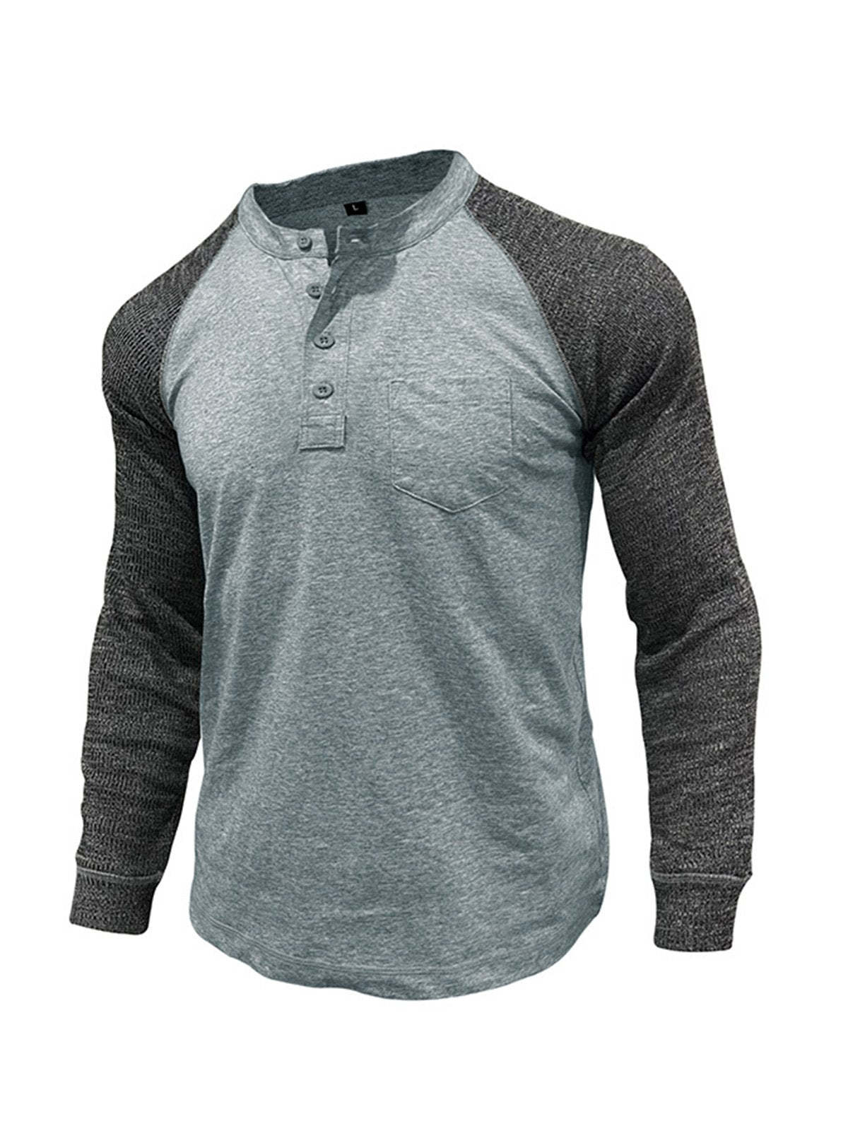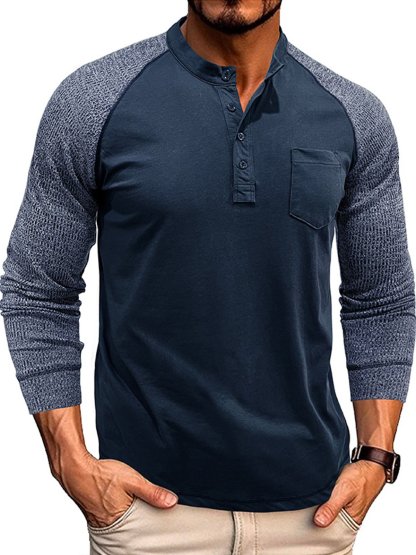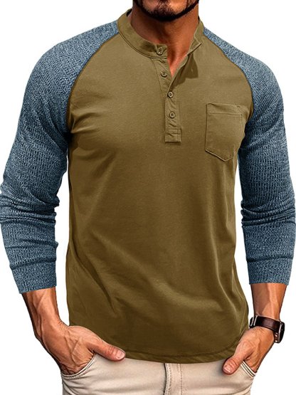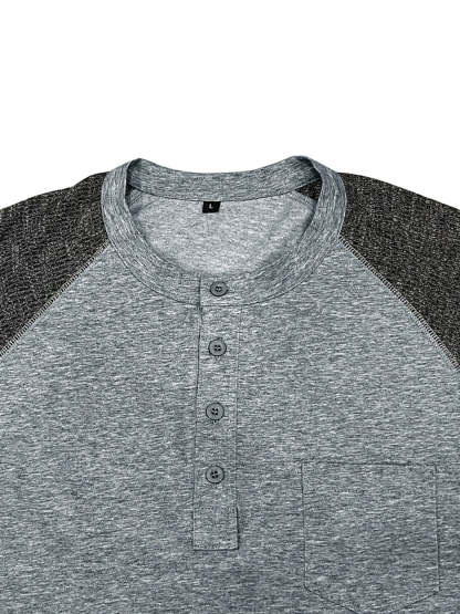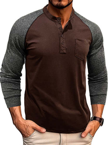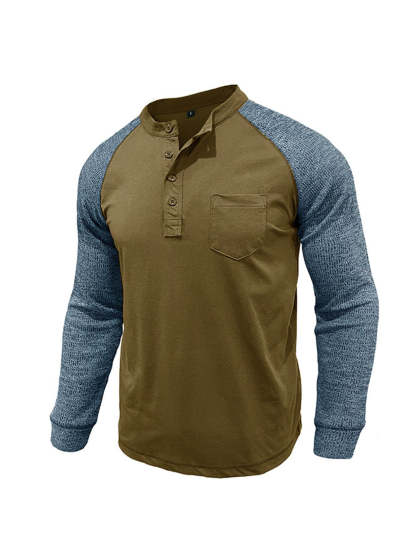 Men's Casual Raglan Henley Collar Patch Long Sleeve T-Shirt
