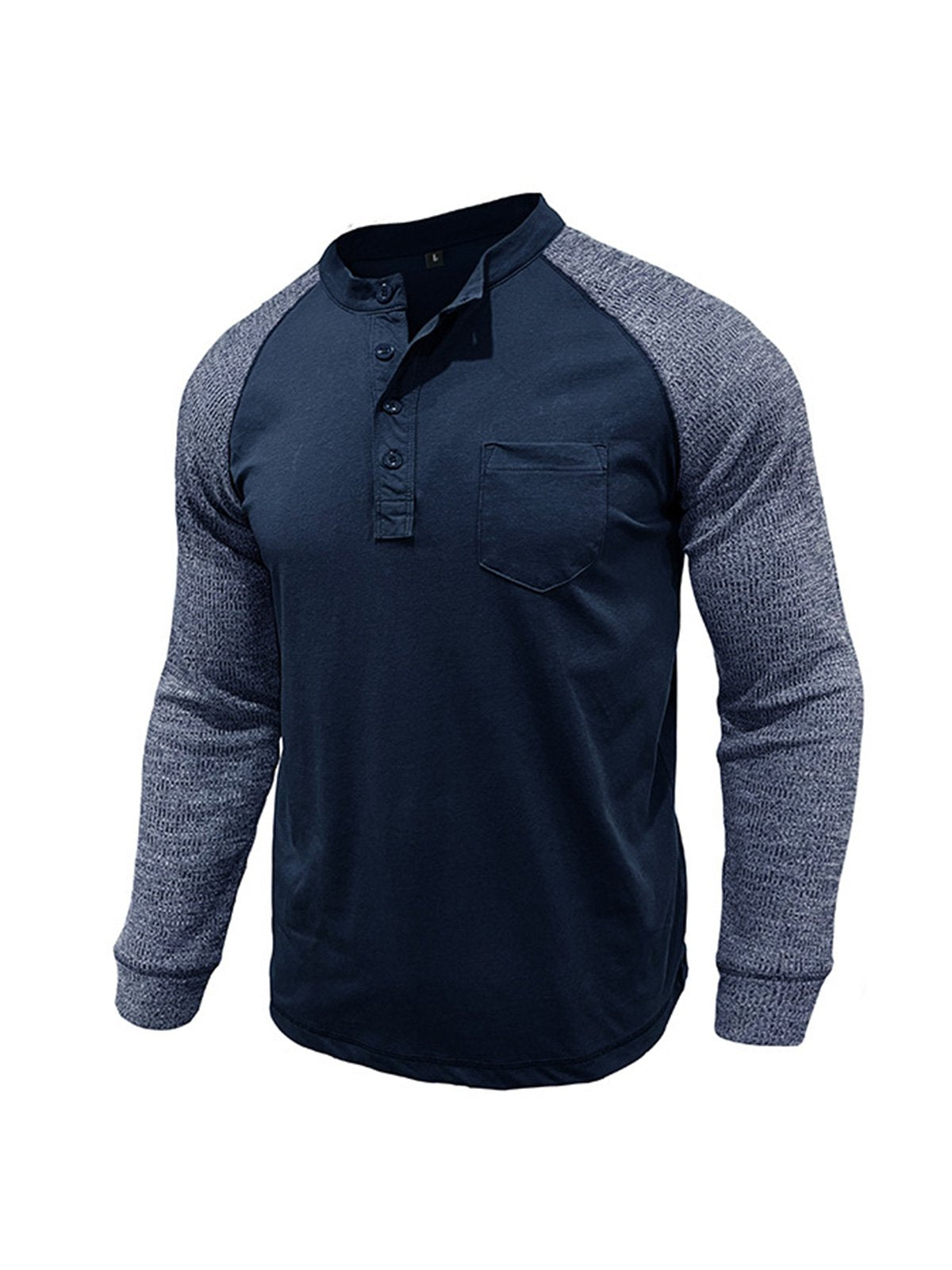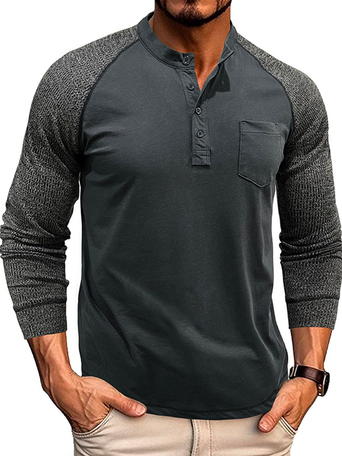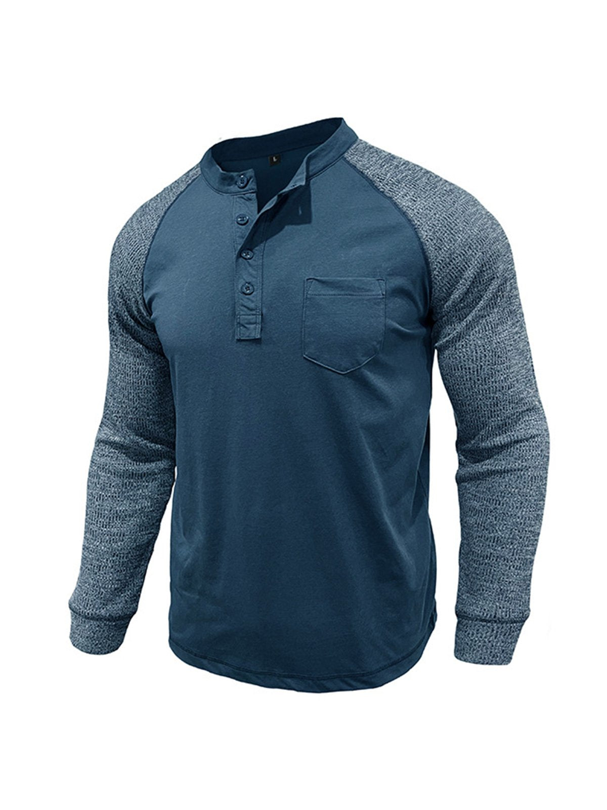 Men's Casual Raglan Henley Collar Patch Long Sleeve T-Shirt