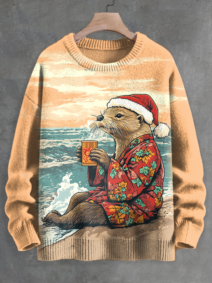 Men's Kimono Otter Drinking Hot Tea Art Print Knit Sweatshirt