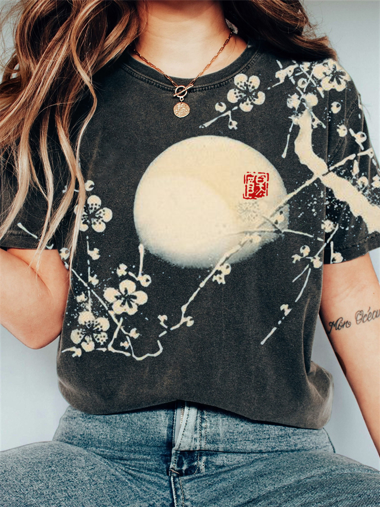 Plum Blossom & Moon Japanese Lino Art Vintage T Shirt