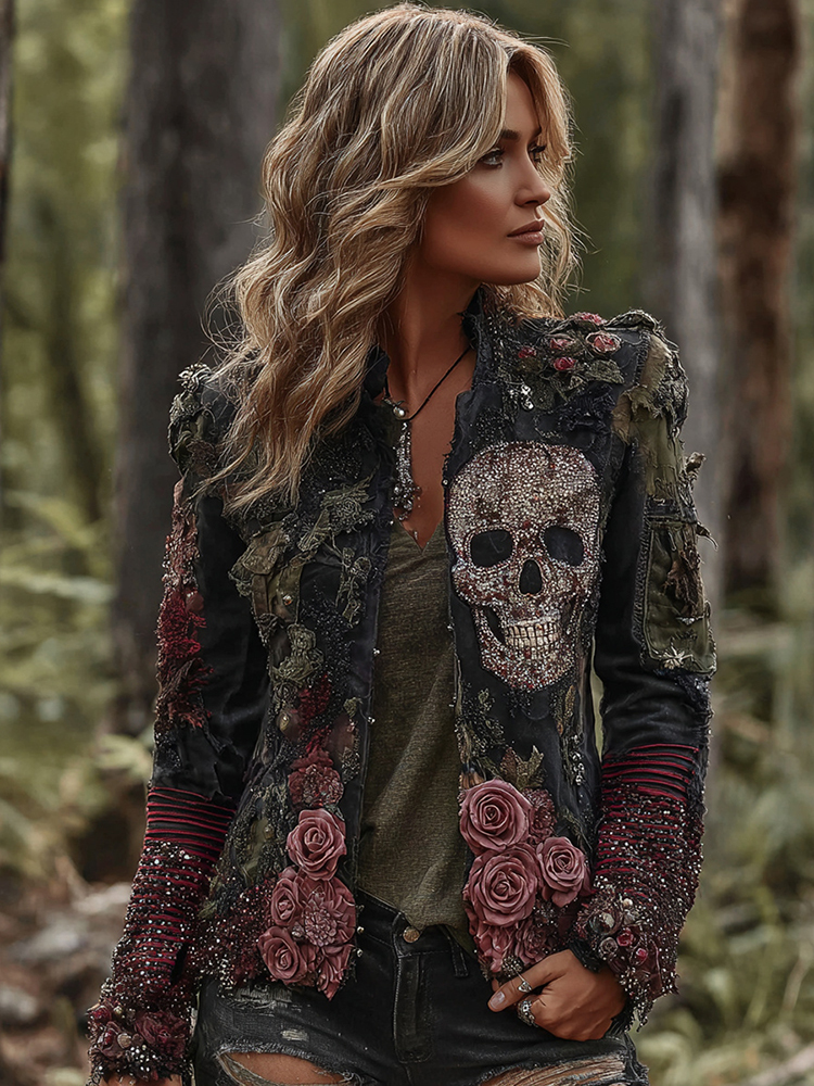 Rose Skull Embroidered Gothic Rough-contrast Denim Jacket