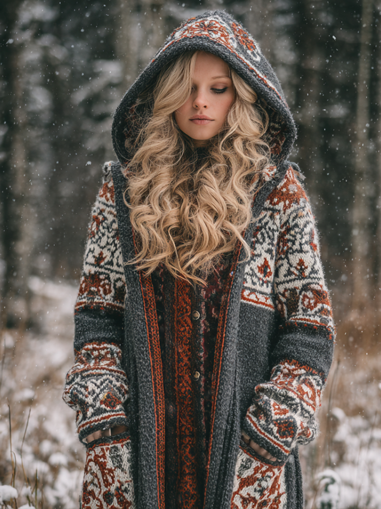 Viking Style Tribal Pattern Element Women's Hooded Pullover Knitted Thick Sweater Long Coat