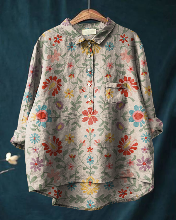 Vintage Floral Print Casual Cotton and Linen Long-sleeved Shirt