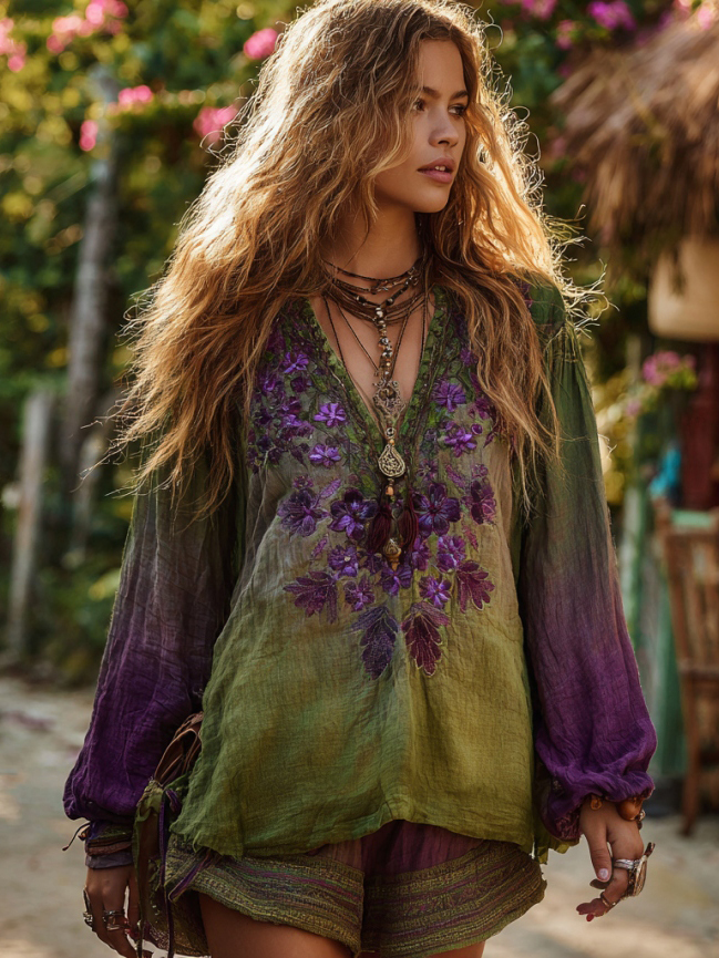 Vintage Purple Floral Embroidery Linen V Neck Long Sleeve Shirt