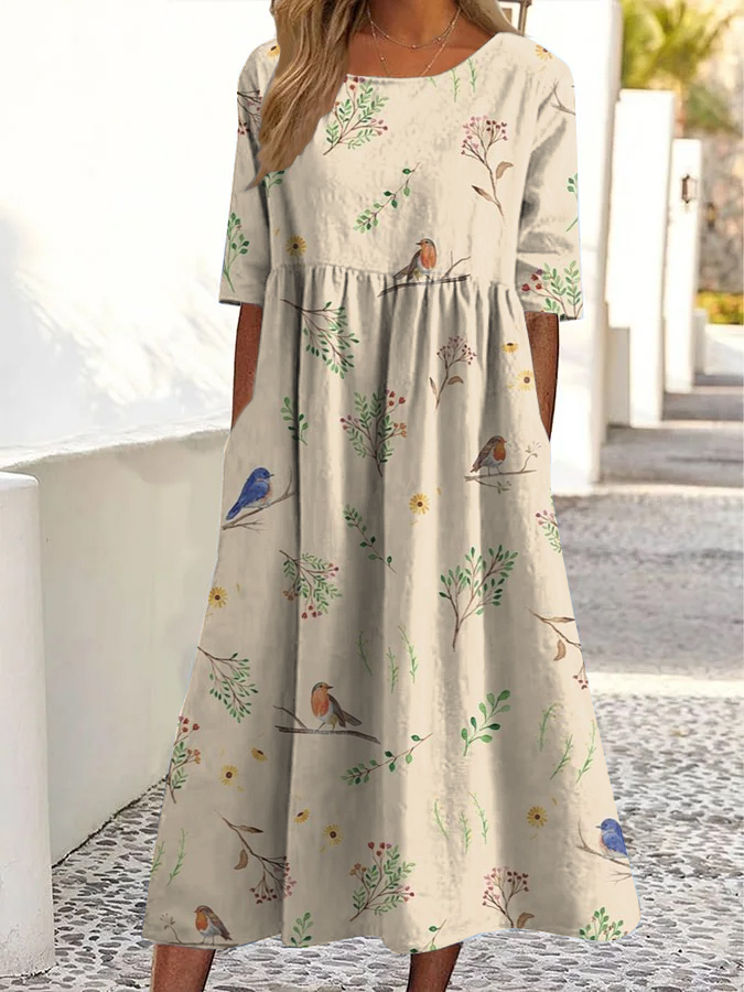 Vintage Robin Floral Print Crew Neck Pocket Midi Dress