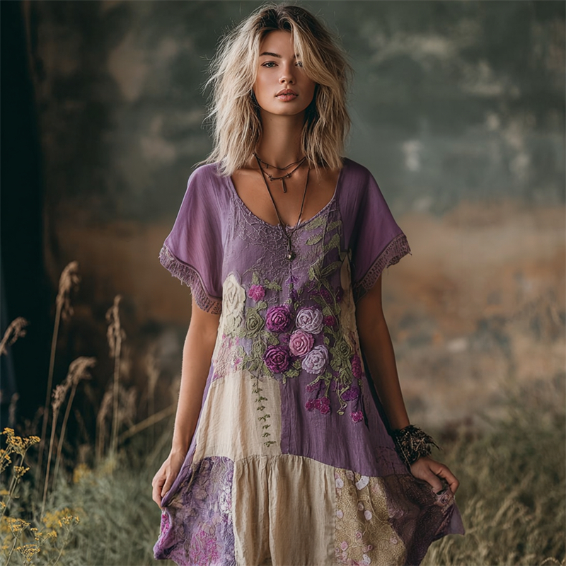 Vintage Roses Embroidered Boho Patchwork Flowy Linen Dress