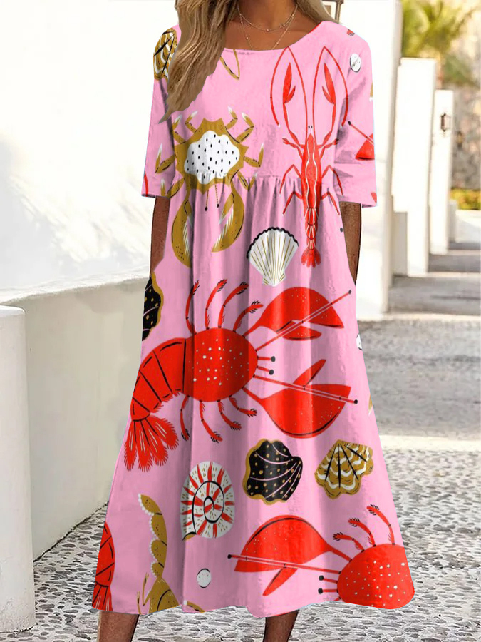 Vintage Sea World Print Round Neck Pocket Midi Dress