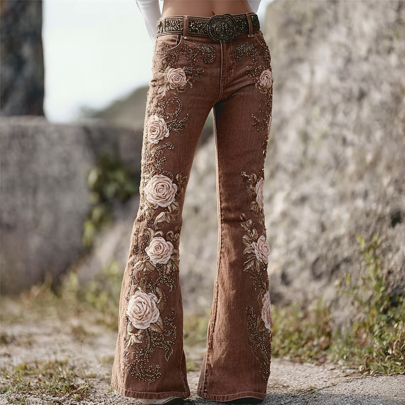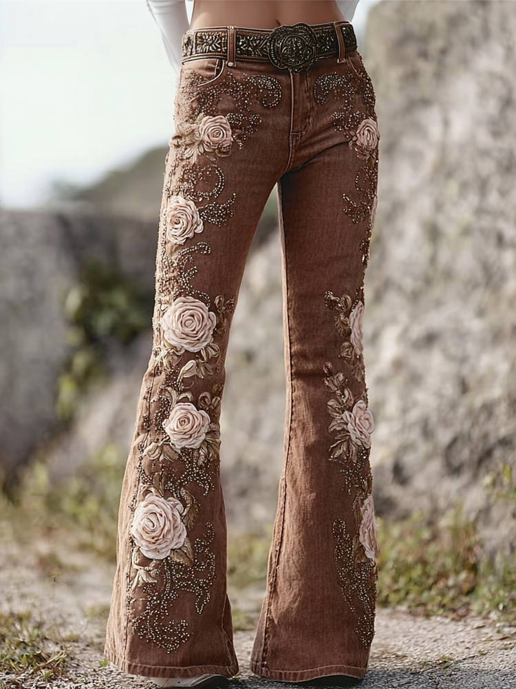 Vintage Western Roses Embroidered Washed Bootcut Jeans