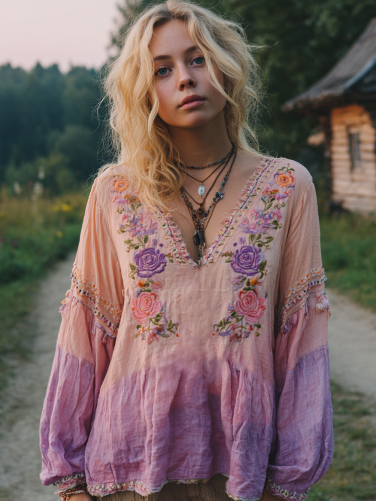 Women's Casual Gradient Purple And Pink Floral Embroidered Linen Long Sleeve Shirt
