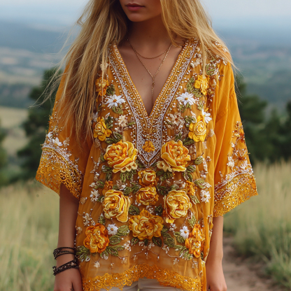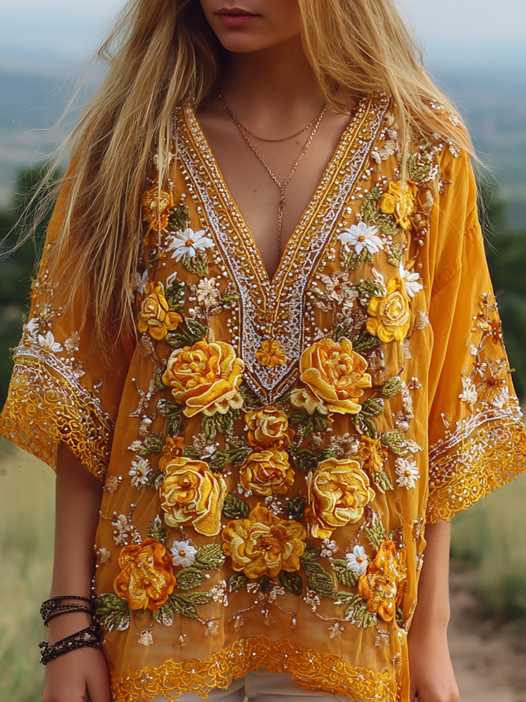 Women's Classic Bohemian Yellow Floral Embroidery Art Linen Blend T-shirt