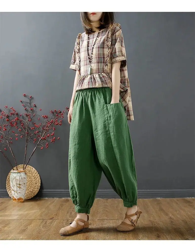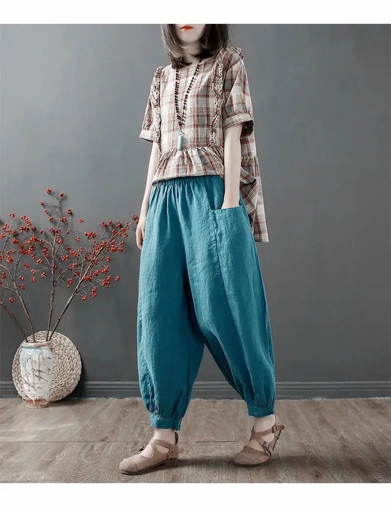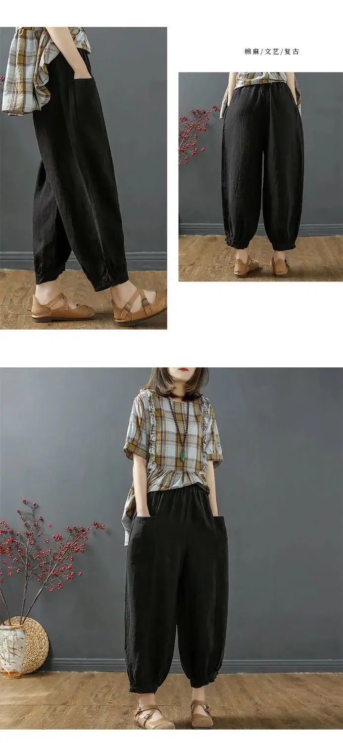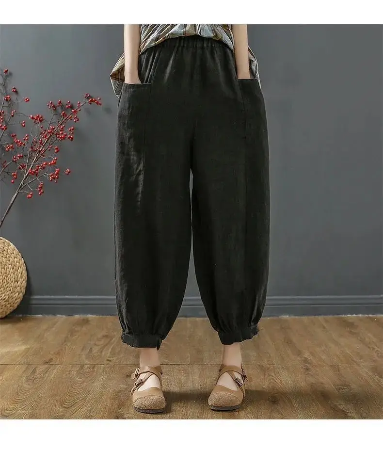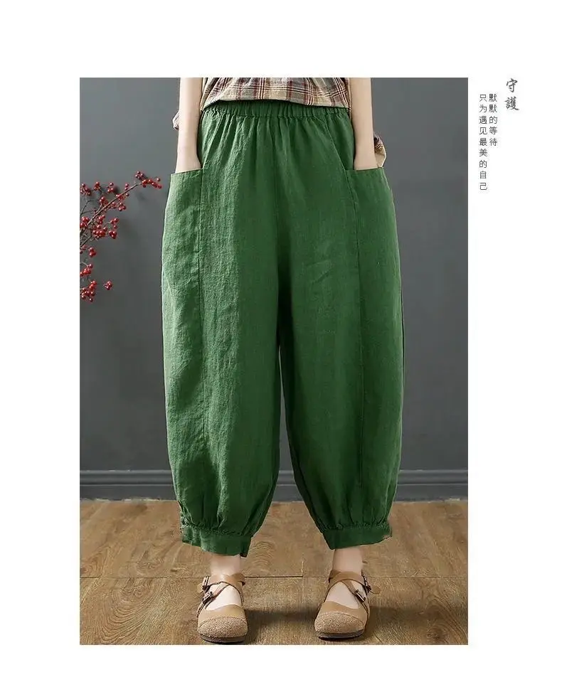 100% cotton and linen knickerbockers women's summer new cropped pants literary and leisure loose toe Joker Harun pants.