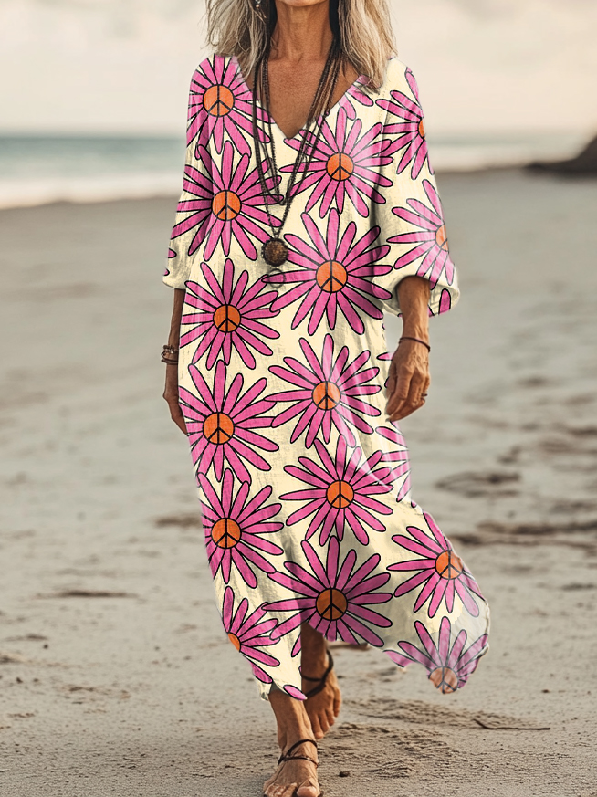 Women's Hippie Floral Art Print Pocket Cotton Dress
