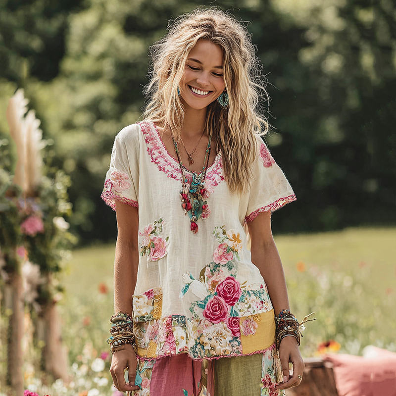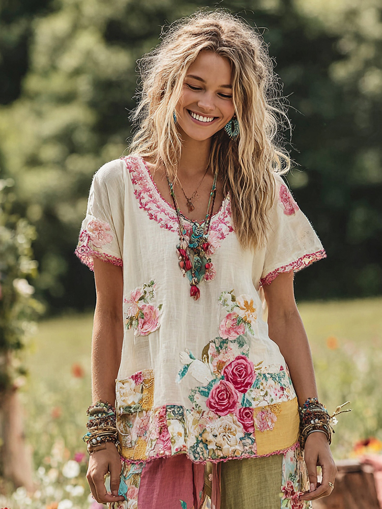 Women's Holiday Embroidered Floral Patchwork T-shirt